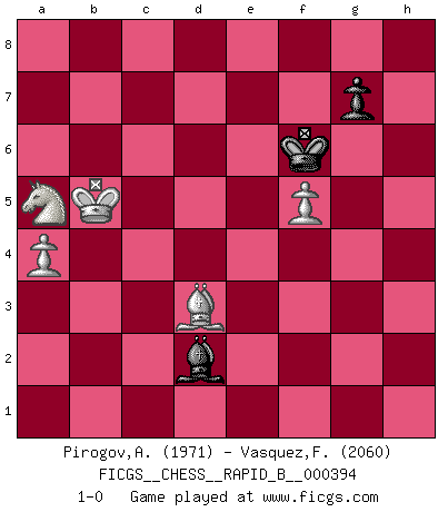 Last move : 1-0 2024 May 28 10:59:18 [Event "FICGS__CHESS__RAPID_B__000394"] [Site "FICGS"] [Date "2024.01.03"] [Round "1"] [White "Pirogov,Andrey Mikhaylovich"] [Black "Vasquez,Fernando"] [Result "1-0"] [WhiteElo "1971"] [BlackElo "2060"] 1.Nf3 Nf6 2.c4 e6 3.g3 d5 4.Bg2 Be7 5.O-O O-O 6.d4 dxc4 7.Qc2 a6 8.a4 Bd7 9.Qxc4 Bc6 10.Bg5 Bd5 11.Qc2 Be4 12.Qc1 Nc6 13.e3 Nb4 14.Nc3 Bc6 15.Rd1 a5 16.e4 h6 17.Bxf6 Bxf6 18.h4 Qd7 19.g4 Bd8 20.g5 hxg5 21.hxg5 Qe8 22.d5 exd5 23.exd5 Bd7 24.Re1 Be7 25.d6 cxd6 26.Qe3 Bd8 27.Qf4 Nd3 28.Qh2 Nxe1 29.Rxe1 Be6 30.Bf1 Rc8 31.Bb5 Qe7 32.Re4 Rc5 33.Rh4 Rxg5+ 34.Kf1 f5 35.Rh8+ Kf7 36.Nxg5+ Qxg5 37.Rxf8+ Kxf8 38.Qh8+ Bg8 39.Bc4 Qc1+ 40.Ke2 Qxb2+ 41.Kd1 d5 42.Bxd5 Bf6 43.Qxg8+ Ke7 44.Qe6+ Kd8 45.Qd6+ Ke8 46.Be6 Qa1+ 47.Ke2 Qb2+ 48.Kf1 Qc1+ 49.Nd1 Qc6 50.Qxc6+ bxc6 51.Bxf5 Ke7 52.Ke2 Kd6 53.Ne3 Kc5 54.Bd7 Kd6 55.Be8 Kc5 56.Kd3 Bd4 57.Ke4 Ba1 58.f4 Bc3 59.Ng4 Kd6 60.Nh2 c5 61.Bf7 Ke7 62.Bc4 Kf6 63.Ng4+ Kg6 64.Ne5+ Kh5 65.Kd5 Bb4 66.Nc6 Bd2 67.f5 Kg5 68.Bd3 Kf6 69.Kxc5 Kg5 70.Kb5 Kf6 71.Nxa5 1-0 Follow this game move after move (download)Play the opening like a book, the middle game like a magician, and the endgame like a machine. (Spielmann) Charakterschwächen offenbaren sich normalerweise während einer Schachpartie. (Garry Kasparov) Cuando tu casa esta en llamas, no puedes ser molestado por tus vecinos. O, como decinos en Ajedrez, si tu Rey esta bajo ataque, no te preocupa perder un Peón del lado de la Reina. (Gary Kasparov) Si je n'étais pas joueur d'échecs, je serais le meilleur dans quelque chose d'autre. (Anatoli Karpov) The message for business people contemplating their place in the cyberspace is simple and direct: get linked or get lost. (Vic Sussman and Kenan Pollack)
