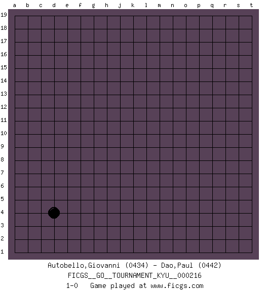 Last move : 1-0 2024 February 4 9:20:17 [Event "FICGS__GO__TOURNAMENT_KYU__000216"] [Site "FICGS"] [Date "2024.01.04"] [Round "1"] [Black "Autobello,Giovanni"] [White "Dao,Paul"] [Result "1-0"] [Rating 1 "0434"] [Rating 2 "0442"] 1.d4 1-0 This go game has been lost on time (started : 2024.01.04 21:0:59) Follow this game move after move (download)One big eye kills one small eye. (Anonymous) You can only get smarter by playing a smarter opponent. (Revolver, movie)