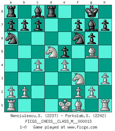 Last move : 1-0 2007 December 4 8:17:2 [Event "FICGS__CHESS__CLASS_M__000013"] [Site "FICGS"] [Date "2007.09.12"] [Round "1"] [White "Nenciulescu,Silviu"] [Black "Porkolab,Sandor"] [Result "1-0"] [WhiteElo "2237"] [BlackElo "2242"] 1.d4 Nf6 2.c4 g6 3.Nc3 Bg7 4.e4 d6 5.Nf3 O-O 6.h3 e5 7.dxe5 dxe5 8.Qxd8 Rxd8 9.Bg5 Na6 10.Nd5 1-0 This chess game has been lost on time (started : 2007.09.12 20:4:19) King's Indian : 5.Nf3 Kingside Castling by player Black (move 5) Player White won this chess game. Follow this game move after move (download)Alekhine is a poet who creates a work of art out of something that would hardly inspire another man to send home a picture post card. (Max Euwe) Bobby Fischer ist kein Vorbild für die heutige Jugend. (Viktor Kortschnoi) El Ajedrez demanda una total concentración. (Bobby Fischer) Le jeu d'échecs est comme rejeté hors du temps. (Antoine de Saint-Exupéry) The general who wins the battle makes many calculations in his temple before the battle is fought. The general who loses makes but few calculations beforehand. (Sun Tzu)