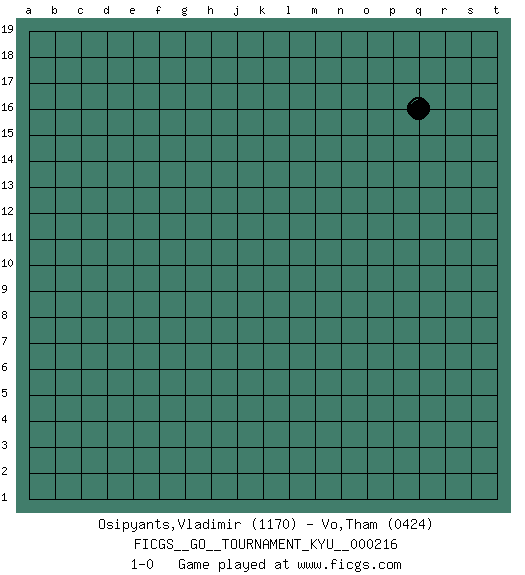 Last move : 1-0 2024 February 4 9:20:17 [Event "FICGS__GO__TOURNAMENT_KYU__000216"] [Site "FICGS"] [Date "2024.01.04"] [Round "1"] [Black "Osipyants,Vladimir"] [White "Vo,Tham"] [Result "1-0"] [Rating 1 "1170"] [Rating 2 "0424"] 1.q16 1-0 This go game has been lost on time (started : 2024.01.04 21:0:59) Follow this game move after move (download)Beginner's games are surprising, often incoherent and incomprehensible. When you improve, your game gains in consistency but flirts with stupidity: you become satisfied with truisms and mechanical movements, you try to obtain a feeling for clearness and style the easy way. (Pierre Audouard) History is a gallery of pictures in which there are few originals and many copies. (Alexis de Tocqueville)