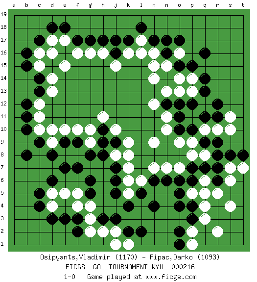Last move : 1-0 2024 February 28 7:41:0 [Event "FICGS__GO__TOURNAMENT_KYU__000216"] [Site "FICGS"] [Date "2024.01.04"] [Round "1"] [Black "Osipyants,Vladimir"] [White "Pipac,Darko"] [Result "1-0"] [Rating 1 "1170"] [Rating 2 "1093"] 1.q16 q4 2.d3 d16 3.c5 d10 4.k4 o16 5.q14 p14 6.q13 p13 7.j16 q10 8.m17 m16 9.n17 k16 10.j17 j15 11.k17 l16 12.n16 n15 13.o17 k5 14.j5 k6 15.j6 k7 16.o15 o14 17.p15 q12 18.n14 m15 19.p12 o13 20.o12 n13 21.n12 m14 22.q11 m12 23.r11 r10 24.p10 p9 25.o10 o9 26.m4 j8 27.f7 f8 28.d8 h16 29.c13 d13 30.c14 d14 31.b16 n10 32.g8 g9 33.f9 e8 34.e9 e10 35.e7 f10 36.h9 g10 37.h8 j10 38.h10 h11 39.j9 k9 40.j7 k8 41.l5 l6 42.m6 m7 43.n6 n7 44.p6 q6 45.p7 o7 46.o6 p8 47.q7 r5 48.r6 q5 49.q9 q8 50.r9 s10 51.r8 s11 52.r12 n11 53.o11 m9 54.p3 s6 55.r7 q3 56.o4 s7 57.s8 t7 58.t8 s4 59.f17 f16 60.g17 g16 61.h17 l17 62.l18 e17 63.c17 c15 64.b15 c16 65.e18 d17 66.d18 e15 67.c9 c10 68.b11 c11 69.b10 c12 70.b12 p5 71.o5 p2 72.o2 p1 73.o1 r2 74.p4 d9 75.b8 g3 76.h3 h2 77.f2 g2 78.j3 j2 79.k2 f4 80.e3 e5 81.g5 f5 82.d6 g4 83.g6 d4 84.c4 d5 85.f3 k1 86.l2 j1 87.pass 1-0 Follow this game move after move (download)Eyes win semiais. (Anonymous) I don't know, I don't care, and it doesn't make any difference. (Albert Einstein)