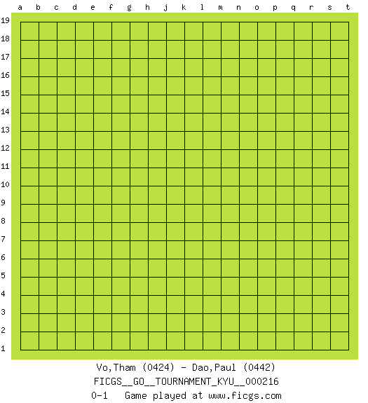 Last move : 0-1 2024 February 4 9:20:17 [Event "FICGS__GO__TOURNAMENT_KYU__000216"] [Site "FICGS"] [Date "2024.01.04"] [Round "1"] [Black "Vo,Tham"] [White "Dao,Paul"] [Result "0-1"] [Rating 1 "0424"] [Rating 2 "0442"] 0-1 This go game has been lost on time (started : 2024.01.04 21:0:59) Follow this game move after move (download)More haste less speed. (John Fairbairn) Somewhere in the world there is an epigram for every dilemma. (Hendrik Willem van Loon)