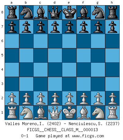Last move : 0-1 2007 October 23 1:48:35 [Event "FICGS__CHESS__CLASS_M__000013"] [Site "FICGS"] [Date "2007.09.12"] [Round "1"] [White "Valles Moreno,Ivan"] [Black "Nenciulescu,Silviu"] [Result "0-1"] [WhiteElo "2402"] [BlackElo "2237"] 0-1 This chess game has been lost on time (started : 2007.09.12 20:4:19) Player Black won this chess game. Follow this game move after move (download)When you are lonely, when you feel yourself an alien in the world, play Chess. This will raise your spirits and be your counselor in war. (Aristotle) Wenn sie aufgeben, dann danke ich Ihnen für das Spiel (Eventualzug beim Fernschach). (Anonymous) Siempre es mucho mejor sacrificar las piezas de tu oponente. (Savielly Tartakover) La conception d'un plan est le processus par lequel un joueur exploite les avantages de sa position tout en s'efforçant d'en réduire au minimum les inconvénients. Afin de garantir le succès, un plan doit toujours se fonder sur un diagnostic objectif des particularités d'une position. La conception d'un plan est d'autant plus difficile que la position est équilibrée, et grandement facilitée lorsqu'il n'existe qu'un seul plan susceptible de répondre aux exigences de la position. (Harry Golombek) Humor is by far the most significant activity of the human brain. (Edward De Bono)