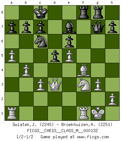 Last move : 1/2-1/2 2024 March 5 23:40:58 [Event "FICGS__CHESS__CLASS_M__000132"] [Site "FICGS"] [Date "2024.01.07"] [Round "1"] [White "Swiatek,Janusz"] [Black "Broekhuizen,A. T. S."] [Result "1/2-1/2"] [WhiteElo "2245"] [BlackElo "2251"] 1.e4 Nc6 2.d4 d5 3.e5 Bf5 4.c3 e6 5.Nd2 f6 6.f4 g5 7.Ndf3 gxf4 8.Bd3 Bxd3 9.Qxd3 fxe5 10.dxe5 Nge7 11.Ne2 Ng6 12.Nxf4 Nxf4 13.Bxf4 Qd7 14.O-O O-O-O 15.b4 Rg8 16.a4 Qg7 17.g3 Be7 18.a5 Rdf8 1/2-1/2 Follow this game move after move (download)A player surprised is half beaten. (Proverb) Jeder Schachmeister war einmal ein Anfänger. (Irving Chernev) Nunca nadie ha ganado una partida de Ajedrez rindiendose. (Unknown) La menace est plus forte que l'exécution. (Aaron Nimzovitch) Those parts of the system that you can hit with a hammer (not advised) are called hardware; those program instructions that you can only curse at are called software. (Anonymous)