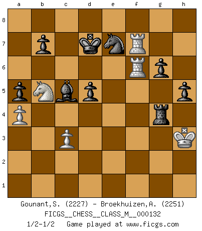 Last move : 1/2-1/2 2024 March 13 20:42:56 [Event "FICGS__CHESS__CLASS_M__000132"] [Site "FICGS"] [Date "2024.01.07"] [Round "1"] [White "Gounant,Stanislas"] [Black "Broekhuizen,A. T. S."] [Result "1/2-1/2"] [WhiteElo "2227"] [BlackElo "2251"] 1.b3 e5 2.Bb2 Nc6 3.e3 d5 4.Bb5 Bd6 5.f4 f6 6.Qh5+ g6 7.Qh4 exf4 8.Nf3 fxe3 9.O-O Bd7 10.Nc3 Nce7 11.dxe3 c6 12.Bd3 Qc7 13.e4 O-O-O 14.exd5 cxd5 15.Kh1 h5 16.a4 a6 17.b4 Nh6 18.b5 a5 19.b6 Qxb6 20.Nb5 Bc5 21.Qxf6 Qxf6 22.Bxf6 Rhf8 23.Bg7 Ng4 24.Bxf8 Rxf8 25.h3 Ne3 26.Rfe1 Nc6 27.c3 Bxh3 28.Nfd4 Nxg2 29.Bf1 Bxd4 30.Bxg2 Bxg2+ 31.Kxg2 Rf2+ 32.Kg3 Bc5 33.Rf1 Re2 34.Rf7 Ne7 35.Raf1 Kd7 36.R1f6 Re4 37.Kh3 Rg4 1/2-1/2 A. T. S. Broekhuizen Yes it was a wild game. I would not want to play this over the board. Follow this game move after move (download)After a bad opening, there is hope for the middle game. After a bad middle game, there is hope for the endgame. But once you are in the endgame, the moment of truth has arrived. (Edmar Mednis) Schach ist Kampf, hauptsächlich jedoch gegen die eigenen Fehler. (Savielly Grigorievitsch Tartakower) Los Peones son el alma de una partida de Ajedrez. (Francois Andre Danican Philidor) Les Echecs mettent en conflit, non pas deux intelligences, mais deux volontés. (Lasker) Home computers are being called upon to perform many new functions, including the consumption of homework formerly eaten by the dog. (Doug Larson)