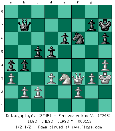 Last move : 1/2-1/2 2024 May 24 3:4:45 [Event "FICGS__CHESS__CLASS_M__000132"] [Site "FICGS"] [Date "2024.01.07"] [Round "1"] [White "Duttagupta,Aniruddha"] [Black "Perevozchikov,Vjacheslav"] [Result "1/2-1/2"] [WhiteElo "2245"] [BlackElo "2243"] 1.e4 e6 2.d3 d5 3.Nd2 c5 4.Ngf3 Nc6 5.g3 Nf6 6.Bg2 Be7 7.O-O O-O 8.Re1 Qc7 9.Qe2 b5 10.exd5 exd5 11.Nf1 h6 12.Bf4 Bd6 13.Bxd6 Qxd6 14.a3 Be6 15.Ne5 Rae8 16.Nxc6 Qxc6 17.h4 Bh3 18.Qf3 Bxg2 19.Kxg2 Re6 20.Re3 a5 21.Rae1 a4 22.R3e2 b4 23.Ne3 Rfe8 24.Nf5 Kh7 25.Rxe6 Rxe6 26.Rxe6 fxe6 27.Ne3 Qb7 28.Kh3 1/2-1/2 Follow this game move after move (download)It is peculiar but a fact nevertheless, that gamblers in chess always have enthusiastic followers. (Botvinnik) Die FIDE ist dabei in die Hände der russischen Mafia zu fallen. (Larry Evans) Te sientas frente a un tablero y repentinamente tu corazón brinca. Tu mano tiembla al tomar una pieza y moverla. Pero lo que el Ajedrez te enseña es que tu debes permanecer ahí con calma y pensar de que si realmente es una buena idea o de que si hay otras ideas mejores. (Stanley Kubrick) Nous vivons dans un monde échiquéen : chaque jour qui passe est un défi à relever. (Philosophe Sasha) Art is the triumph over chaos. (John Cheever)