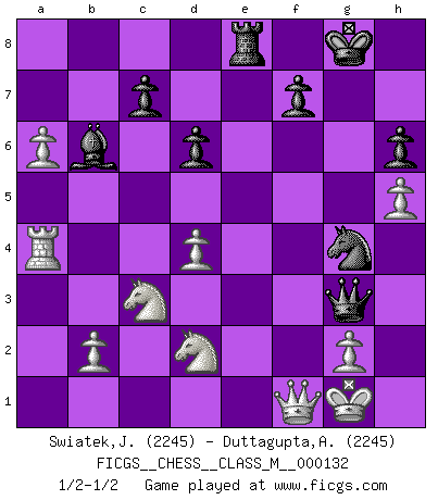Last move : 1/2-1/2 2024 June 14 23:32:39 [Event "FICGS__CHESS__CLASS_M__000132"] [Site "FICGS"] [Date "2024.01.07"] [Round "1"] [White "Swiatek,Janusz"] [Black "Duttagupta,Aniruddha"] [Result "1/2-1/2"] [WhiteElo "2245"] [BlackElo "2245"] 1.e4 e5 2.Nf3 Nc6 3.Bb5 a6 4.Ba4 Nf6 5.O-O b5 6.Bb3 Bb7 7.Re1 Bc5 8.c3 d6 9.d4 Bb6 10.Bg5 h6 11.Bh4 g5 12.Bg3 O-O 13.a4 Re8 14.h4 g4 15.Nh2 Qd7 16.h5 Na5 17.Ba2 exd4 18.cxd4 Bxe4 19.axb5 Qf5 20.Nc3 Bc2 21.Rxe8+ Rxe8 22.Bb1 Bxb1 23.Qxb1 Qg5 24.bxa6 Nb3 25.Ra4 Nc1 26.f4 gxf3 27.Nxf3 Qxg3 28.Qxc1 Ng4 29.Qf1 Ne5 30.Nd2 Ng4 31.Nf3 Ne5 32.Nd2 Ng4 1/2-1/2 Follow this game move after move (download)I don't believe in psychology. I believe in good moves. (Bobby Fischer) Immer nach dem besten Zug zu suchen ist ziemlich unpraktisch. (Nigel Short) Buenas posiciones no logran ganar juegos, buenas movidas sí. (Gerald Abrahams) Seul un grand joueur sait à quel point il joue faiblement. (Xavier Tartacover) To be champion requires more than simply being a strong player; one has to be a strong human being as well. (Anatoly Karpov)