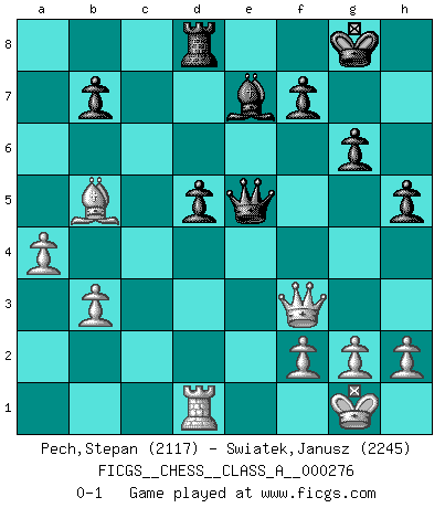 Last move : 0-1 2024 July 7 19:32:5 [Event "FICGS__CHESS__CLASS_A__000276"] [Site "FICGS"] [Date "2024.01.09"] [Round "1"] [White "Pech,Stepan"] [Black "Swiatek,Janusz"] [Result "0-1"] [WhiteElo "2117"] [BlackElo "2245"] 1.e4 c5 2.c3 Nf6 3.e5 Nd5 4.d4 d6 5.Nf3 cxd4 6.cxd4 Nc6 7.Bc4 Nb6 8.Bb5 dxe5 9.Nxe5 Bd7 10.Nxd7 Qxd7 11.Nc3 e6 12.O-O Rd8 13.Be3 Be7 14.Qg4 O-O 15.Rad1 g6 16.d5 Nxd5 17.Bxa7 h5 18.Qf3 Qc7 19.Nxd5 Rxd5 20.Rxd5 exd5 21.Be3 Qe5 22.a4 Nd4 23.Bxd4 Qxd4 24.b3 Rd8 25.Rd1 Qe5 0-1 This chess game has been lost on time (started : 2024.01.09 21:40:39) Follow this game move after move (download)The sign of a great Master is his ability to win a won game quickly and painlessly. (Irving Chernev) Eine Person mit durchschnittlichem IQ kann etwa eine ELO von 2000 erreichen. (Jonathan Levitt) Tu sabes que vas a perder. Aún cuando tenía la ventaja, yo sabía que iba a perder. - al estar jugando con Fischer (Andrew Soltis) À la honte des hommes, on sait que les lois du jeu sont les seules qui soient partout justes, claires, inviolables et exécutées. Pourquoi l'Indien qui a donné les règles du jeu d'échecs est-il obéi de bon gré dans toute la terre, et que les décrétales des papes, par exemple, sont aujourd'hui un objet d'horreur et de mépris ? C'est que l'inventeur des échecs combina tout avec justesse pour la satisfaction des joueurs, et que les papes, dans leurs décrétales, n'eurent en vue que leur seul avantage. L'Indien voulut exercer également l'esprit des hommes et leur donner du plaisir; les papes ont voulu abrutir l'esprit des hommes. Voltaire (Dictionnaire philosophique / Garnier 1967) Without enthusiasm, virtue functions not at all, and vice only poorly. (Mignon McLaughlin, The Neurotic's Notebook, 1960)