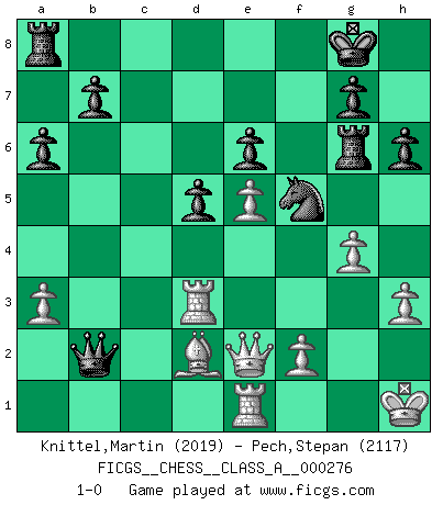 Last move : 1-0 2024 August 12 15:32:33 [Event "FICGS__CHESS__CLASS_A__000276"] [Site "FICGS"] [Date "2024.01.09"] [Round "1"] [White "Knittel,Martin"] [Black "Pech,Stepan"] [Result "1-0"] [WhiteElo "2019"] [BlackElo "2117"] 1.e4 c5 2.Nf3 Nc6 3.Bb5 d6 4.O-O Bd7 5.Re1 Nf6 6.c3 a6 7.Bf1 Bg4 8.d4 cxd4 9.cxd4 d5 10.e5 Ng8 11.Re3 e6 12.h3 Bh5 13.Be2 Nge7 14.Nbd2 Bg6 15.Rc3 Nc8 16.Bd3 Bb4 17.Rb3 Bxd3 18.Rxd3 O-O 19.Qe2 N8e7 20.a3 Bxd2 21.Bxd2 h6 22.Re1 f6 23.exf6 Rxf6 24.Nh2 Nf5 25.Ng4 Rg6 26.Ne5 Nxe5 27.dxe5 Qb6 28.Kh1 Qxb2 29.g4 1-0 This chess game has been lost on time (started : 2024.01.09 21:40:39) Follow this game move after move (download)When you absolutely don't know what to do anymore, it is time to panic. (John van der Wiel) Versuche, dich von der Sklaverei der Eröffnungsvarianten zu befreien. Stattdessen soll man gewisse Typenpositionen erlernen, die man eingehend analysiert. (Aaron Nimzowitsch) Sin errores no puede haber brillantez. (Emanuel Lasker) Mais l'homme est une créature légère et illogique : semblable au joueur d'échecs, il n'aime que le processus du but à atteindre, non le but lui-même. (Dostoïevsky) Hold em is to stud what chess is to checkers. (Johnny Moss)