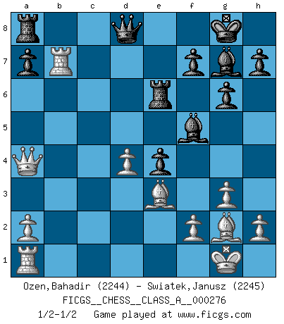 Last move : 1/2-1/2 2024 March 10 7:1:50 [Event "FICGS__CHESS__CLASS_A__000276"] [Site "FICGS"] [Date "2024.01.09"] [Round "1"] [White "Ozen,Bahadir"] [Black "Swiatek,Janusz"] [Result "1/2-1/2"] [WhiteElo "2244"] [BlackElo "2245"] 1.Nf3 d5 2.g3 g6 3.Bg2 Bg7 4.d4 Nf6 5.c4 c6 6.cxd5 cxd5 7.Nc3 O-O 8.O-O Ne4 9.Ne5 Bf5 10.Bf4 Nxc3 11.bxc3 Nc6 12.Nxc6 bxc6 13.Qa4 Qb6 14.e4 dxe4 15.Rfb1 Qd8 16.Rb7 Re8 17.Qxc6 e5 18.Be3 exd4 19.cxd4 Re6 20.Qa4 1/2-1/2 Follow this game move after move (download)Chess is really ninety nine percent calculation. (Soltis) Habe Mut, dich deines eigenen Verstandes zu bedienen. (Immanuel Kant) El Ajedrez, como cualquier actividad creativa, solo puede existir a través del esfuerzo combinado de aquellos que tienen talento creativo y de aquellos que poseen la habilidad de organizar su trabajo creativo. (Mikhail Botvinnik) Que feriez-vous si vous étiez en train de jouer aux échecs et que la fin du monde arrive ? Je continuerais à jouer. (Saint Borromée) Pushing plastic is for the many, pushing virtual pieces is for the fewer, pushing wood is for the very few. (Normajean Yates)