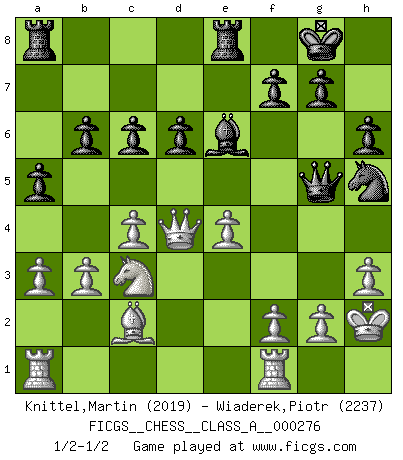 Last move : 1/2-1/2 2024 March 21 20:11:5 [Event "FICGS__CHESS__CLASS_A__000276"] [Site "FICGS"] [Date "2024.01.09"] [Round "1"] [White "Knittel,Martin"] [Black "Wiaderek,Piotr"] [Result "1/2-1/2"] [WhiteElo "2019"] [BlackElo "2237"] 1.c4 e5 2.Nc3 Nf6 3.Nf3 Nc6 4.e4 Bb4 5.d3 d6 6.h3 Bc5 7.Be2 O-O 8.O-O a5 9.Na4 b6 10.Nc3 h6 11.Be3 Re8 12.Qd2 Bd7 13.a3 Nd4 14.Bd1 Ne6 15.Bc2 Nh5 16.Kh2 c6 17.d4 exd4 18.Nxd4 Nxd4 19.Bxd4 Be6 20.b3 Bxd4 21.Qxd4 Qg5 1/2-1/2 Follow this game move after move (download)If your opponent cannot do anything active, then don't rush the position; instead you should let him sit there, suffer, and beg you for a draw. (Jeremy Silman) Meine Liebe ist Schach, Schach, Schach. Ich muss jeden Tag Schach spielen, deshalb fühle ich mich so stark. (Miguel Najdorf) Haz el enroque temprano y seguido. (Rob Sillars) La guerre est enfant de la passion, la passion est enfant du narcissisme et le narcissisme est l'enfant. (...) Une autre partie ? (Thibault de Vassal) Man with more than one clock never knows what time it is. (Chinese thought)