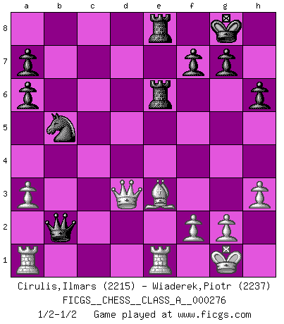Last move : 1/2-1/2 2024 March 16 12:7:15 [Event "FICGS__CHESS__CLASS_A__000276"] [Site "FICGS"] [Date "2024.01.09"] [Round "1"] [White "Cirulis,Ilmars"] [Black "Wiaderek,Piotr"] [Result "1/2-1/2"] [WhiteElo "2215"] [BlackElo "2237"] 1.d4 d5 2.e3 Nf6 3.c4 e6 4.cxd5 exd5 5.Nc3 Bd6 6.Bd3 O-O 7.h3 Re8 8.Nf3 c6 9.O-O h6 10.Qc2 Qe7 11.Nd2 Na6 12.a3 c5 13.Bxa6 cxd4 14.exd4 bxa6 15.Nf3 Qb7 16.Ne5 Bxe5 17.dxe5 Rxe5 18.Bf4 Bf5 19.Qd2 Re6 20.Rfe1 Rae8 21.Be3 d4 22.Qxd4 Ne4 23.Qd5 Qxb2 24.Qxf5 Nxc3 25.Qd3 Nb5 1/2-1/2 Follow this game move after move (download)The beauty of a move lies not in its' appearance but in the thought behind it. (Siegbert Tarrasch) Bobby Fischer ist kein Vorbild für die heutige Jugend. (Viktor Kortschnoi) Yo no le temo a Spassky. Todos saben que yo soy el mejor. Uno no necesita un torneo para probarlo. (Bobby Fischer) Le profane ne songe pas à la somme de jouissance dont il se prive, qui méconnaît ce jeu aux ressources aussi variées que passionnantes. (Jean-Marie Jeanton-Lamarche) I just play for fun. (Anna Kournikova)