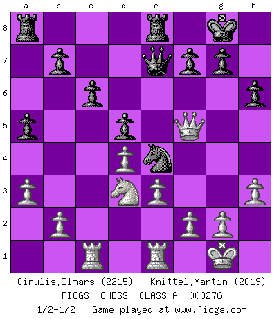 Last move : 1/2-1/2 2024 February 13 21:19:9 [Event "FICGS__CHESS__CLASS_A__000276"] [Site "FICGS"] [Date "2024.01.09"] [Round "1"] [White "Cirulis,Ilmars"] [Black "Knittel,Martin"] [Result "1/2-1/2"] [WhiteElo "2215"] [BlackElo "2019"] 1.d4 Nf6 2.c4 e6 3.a3 d5 4.cxd5 exd5 5.Nc3 c6 6.Bg5 Bf5 7.e3 Nbd7 8.Nge2 Qb6 9.Na4 Qc7 10.Rc1 Bd6 11.Bf4 O-O 12.Ng3 Be4 13.Bxd6 Qxd6 14.Nc3 Bg6 15.Be2 Nb6 16.O-O Rfe8 17.Re1 Qe7 18.Bf1 Nc8 19.Nce2 h6 20.h3 a5 21.Nf4 Bh7 22.Bd3 Bxd3 23.Qxd3 Nd6 24.Nf5 Nxf5 25.Qxf5 Ne4 26.Nd3 1/2-1/2 Follow this game move after move (download)A great player and a great example for many. His book My 60 Memorable Games had a big impact on me. It is a shame he didn't continue to enrich the world of chess with his unparalleled understanding after 1972. (Jan Timman, about Bobby Fischer's death) Ja, ich habe einmal eine Blitzpartie gespielt, es war in einem Zug, 1929. --im Interview 1989 (Mikhail Moiseyevich Botvinik) La estratégia requiere pensar, la táctica requiere observación. (Max Euwe) On entre au jeu d'Echecs comme on entre en Religion. Pour le joueur d'Echecs, la partie d'Echecs c'est l'office, la messe, le défilé du 1er Mai, le dépôt de gerbe au Monument aux Morts. C'est un drame sacré. (Michel Roos) Memory is a complicated thing, a relative to truth, but not its twin. (Barbara Kingsolver, Animal Dreams)