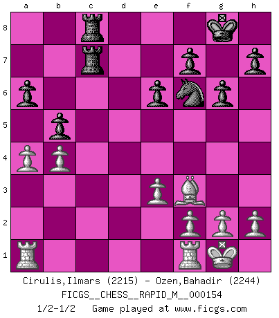 Last move : 1/2-1/2 2024 February 5 11:36:45 [Event "FICGS__CHESS__RAPID_M__000154"] [Site "FICGS"] [Date "2024.01.18"] [Round "1"] [White "Cirulis,Ilmars"] [Black "Ozen,Bahadir"] [Result "1/2-1/2"] [WhiteElo "2215"] [BlackElo "2244"] 1.c4 e6 2.d4 Nf6 3.Bf4 Bb4+ 4.Nd2 c5 5.a3 Bxd2+ 6.Qxd2 cxd4 7.Bxb8 Rxb8 8.Qxd4 b5 9.c5 O-O 10.b4 Bb7 11.e3 Qc7 12.Nf3 Rfd8 13.Be2 d6 14.cxd6 Rxd6 15.Qb2 Rc8 16.O-O Rc6 17.Qe5 a6 18.Qxc7 R6xc7 19.a4 Bxf3 20.Bxf3 g6 1/2-1/2 Follow this game move after move (download)Adequate compensation for a sacrifice is having a sound combination leading to a winning position; adequate compensation for a blunder is having your opponent snatch defeat from the jaws of victory. (Bruce A. Moon) Ich kenne keine einzige Person, die behaupten würde, Garri Kasparow sei ein guter Mensch (Nigel Short) La captura del Rey enemigo es la finalidad pero no el primer objetivo de la partida. (William Steinitz) Vous n'êtes pas toujours obligé de jouer le meilleur coup. Un coup doit être actif, entreprenant, correct et beau ! (David Bronstein) O divine art of subtlety and secrecy! Through you we learn to be invisible, through you inaudible and hence we can hold the enemy's fate in our hands. (Sun Tzu)