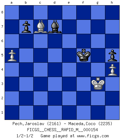 Last move : 1/2-1/2 2024 July 16 4:55:34 [Event "FICGS__CHESS__RAPID_M__000154"] [Site "FICGS"] [Date "2024.01.18"] [Round "1"] [White "Pech,Jaroslav"] [Black "Maceda,Coco"] [Result "1/2-1/2"] [WhiteElo "2161"] [BlackElo "2235"] 1.d4 Nf6 2.c4 e6 3.Nc3 Bb4 4.e3 O-O 5.Bd3 d5 6.Nf3 c5 7.O-O Nc6 8.a3 Bxc3 9.bxc3 Qc7 10.h3 dxc4 11.Bxc4 e5 12.Bb2 Bf5 13.Qe2 Rad8 14.Rfd1 Bg6 15.dxe5 Nxe5 16.Nxe5 Qxe5 17.f3 Nd5 18.Bxd5 Rxd5 19.e4 R5d8 20.c4 Qe7 21.Qf2 f6 22.a4 Bf7 23.e5 f5 24.Qc2 Be6 25.Qc3 Rf7 26.Qe3 h6 27.Rxd8+ Qxd8 28.Qxc5 Rc7 29.Qd6 Qc8 30.Bd4 Rc6 31.Qe7 Rc7 32.Qa3 Rxc4 33.Bxa7 Rc2 34.Bf2 Qc4 35.Qd6 Kh7 36.Qb6 Qc3 37.Qd4 Qb3 38.Qb6 Qd5 39.Qe3 Ra2 40.Rxa2 Qxa2 41.Qd4 Bb3 42.Qf4 Qa1+ 43.Kh2 Be6 44.Qb4 Qxe5+ 45.Bg3 Qd5 46.a5 Qd7 47.Bd6 Qc6 48.Be5 Qd7 49.Qc3 g5 50.Qc7 Qxc7 51.Bxc7 f4 52.Kg1 Kg6 53.Kf2 Kh5 54.Bd6 Bd7 55.g4+ fxg3+ 56.Kxg3 Kg6 57.f4 gxf4+ 58.Bxf4 h5 59.h4 Kf5 60.Bc7 1/2-1/2 Follow this game move after move (download)Chess is mental torture. (Garry Kasparov) Mein Name ist Rustam Kamsky. Sie haben meinen Sohn belästigt. Bereiten Sie sich aufs Sterben vor. (Rustam Kamsky) A la fecha, Fischer esta simplemente un nivel arriba de todos los mejores jugadores de Ajedrez del mundo. (John Jacobs) Des points faibles ou des trous dans la position de l'adversaire doivent être occupés par des pièces et non pas par des pions. (Siegbert Tarrasch) Live, lose, and learn, by observing your opponent how to win. (Amber Steenbock)