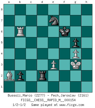 Last move : 1/2-1/2 2024 July 11 4:11:2 [Event "FICGS__CHESS__RAPID_M__000154"] [Site "FICGS"] [Date "2024.01.18"] [Round "1"] [White "Bussoli,Marco"] [Black "Pech,Jaroslav"] [Result "1/2-1/2"] [WhiteElo "2277"] [BlackElo "2161"] 1.d4 d5 2.c4 c6 3.Nc3 Nf6 4.Nf3 e6 5.e3 Nbd7 6.Bd3 dxc4 7.Bxc4 b5 8.Bd3 Bb7 9.a3 b4 10.axb4 Bxb4 11.O-O c5 12.Na2 a5 13.Nxb4 axb4 14.Rxa8 Qxa8 15.Be2 O-O 16.Bd2 Qa5 17.Qe1 Rb8 18.dxc5 Bxf3 19.Bxf3 Nxc5 20.Qb1 Qb5 21.Qc2 b3 22.Qb1 Rd8 23.Bc3 Na4 24.Rc1 Nxc3 25.Rxc3 g6 26.h3 Kg7 27.Qf1 Qb4 28.Qc1 h5 29.Rc4 Qd2 30.Qc3 h4 31.Rc8 Rd3 32.Qc4 Ng8 33.Rb8 Qc2 34.Rc8 Qxc4 35.Rxc4 Rd2 36.Rxh4 Rxb2 37.Rb4 Rb1+ 38.Kh2 Ne7 39.g4 g5 40.Rb5 f5 41.Be2 b2 42.Bc4 Rc1 43.Ba2 Rc2 44.Bxe6 fxg4 45.hxg4 Rxf2+ 46.Kg3 Rd2 47.Ba2 Kf6 48.Rb6+ 1/2-1/2 Follow this game move after move (download)Castle early and often. (Rob Sillars) Garry Kasparov war erst in der Großmeister-Organisation GMA, dann in der Profischach-Vereinigung PCA, zum Schluss kehrte er wieder in den Schoß der FIDE zurück. Aber gut, manche Leute sind flexibel (Viswanathan Anand) Muchos jugadores de Ajedrez se sorprendían cuando después de la partida, Fischer explicaba con calma: 'Yo ya había analizado esta posibilidad' en una posición en la cual yo creía que no era posible de prever desde la apertura. (Mikhail Tal) Il a essayé de se convaincre qu'il pourrait empêcher toutes les erreurs et ne jamais perdre. L'horreur ! Gary Kasparov au sujet de Robert Fischer. The age of a woman doesn't mean a thing. The best tunes are played on the oldest fiddles. (Ralph Waldo Emerson)