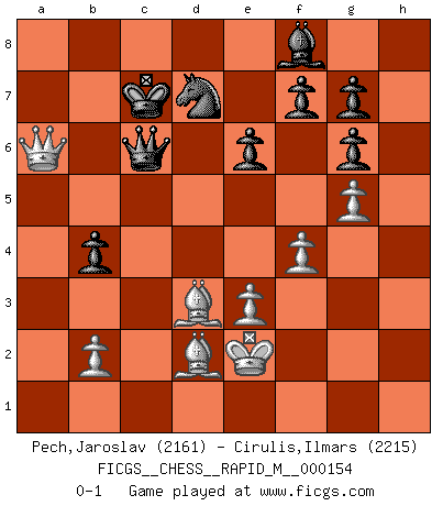Last move : 0-1 2024 April 22 22:52:45 [Event "FICGS__CHESS__RAPID_M__000154"] [Site "FICGS"] [Date "2024.01.18"] [Round "1"] [White "Pech,Jaroslav"] [Black "Cirulis,Ilmars"] [Result "0-1"] [WhiteElo "2161"] [BlackElo "2215"] 1.Nf3 d5 2.c4 c6 3.e3 Nf6 4.d4 Bf5 5.Nc3 e6 6.Nh4 Be4 7.f3 Bg6 8.Nxg6 hxg6 9.Qb3 Qc7 10.Bd2 dxc4 11.Bxc4 b5 12.Bd3 Nbd7 13.g4 Rxh2 14.O-O-O Rxh1 15.Rxh1 O-O-O 16.a4 a6 17.axb5 axb5 18.g5 Nd5 19.Kb1 Nxc3+ 20.Qxc3 Kb7 21.Rc1 Rc8 22.Qc2 Qb6 23.f4 c5 24.dxc5 Rxc5 25.Qb3 Rxc1+ 26.Kxc1 Qc5+ 27.Kd1 Kb6 28.Qa2 b4 29.Qa6+ Kc7 30.Ke2 Qc6 0-1 Follow this game move after move (download)A Chess game is divided into three stages: the first, when you hope you have the advantage, the second when you believe you have an advantage, and the third... when you know you're going to lose ! (Savielly Tartakower) Ich kenne Menschen, die allen Willen der Welt besitzen und doch nicht Schach spielen können. (Robert James Fischer) El jugador de combinación piensa hacia adelante; comienza de la posición dada y trabaja las movidas contundentes en su mente. (Emanuel Lasker) La guerre est enfant de la passion, la passion est enfant du narcissisme et le narcissisme est l'enfant. (...) Une autre partie ? (Thibault de Vassal) The real voyage of discovery consists not in seeking new lands but in seeing with new eyes. (Marcel Proust)