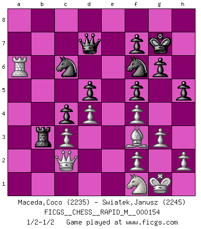 Last move : 1/2-1/2 2024 April 18 4:12:48 [Event "FICGS__CHESS__RAPID_M__000154"] [Site "FICGS"] [Date "2024.01.18"] [Round "1"] [White "Maceda,Coco"] [Black "Swiatek,Janusz"] [Result "1/2-1/2"] [WhiteElo "2235"] [BlackElo "2245"] 1.d4 d5 2.Bf4 c5 3.e3 Nc6 4.c3 Bf5 5.Qb3 Qd7 6.Nf3 e6 7.Be2 Nf6 8.O-O Be7 9.Nbd2 c4 10.Qd1 b5 11.Nh4 O-O 12.Nxf5 exf5 13.b3 Rfc8 14.Bg5 Ne8 15.Bf4 Bd6 16.a4 a6 17.axb5 axb5 18.bxc4 bxc4 19.Bf3 Bxf4 20.exf4 g6 21.Qc2 Nf6 22.Rfb1 Rxa1 23.Rxa1 Rb8 24.Nf1 Rb3 25.Nd2 Rb5 26.Nf1 Rb3 27.Nd2 Rb5 28.Nf1 Kg7 29.g3 h5 30.Ra6 Rb3 1/2-1/2 Follow this game move after move (download)Chess is above all, a fight ! (Emanuel Lasker) Schachspieler können ausgezeichnet Varianten am Schachbrett berechnen, aber nicht im realen Leben. Zu stark ist der Individualismus im Schach ausgeprägt, und für viele ist ein kleiner momentaner persönlicher Vorteil wichtiger als ein weit größerer Vorteil von morgen. (Anatoly Karpov) Coloca el contenido de las piezas del Ajedrez en un sombrero, agitalo vigorosamente, arrojalas en un tablero desde una altura de 30 centimetros y así obtendras el estilo de Steinitz. (H. E. Bird) Donnez-moi un Cavalier en 6e et je gagnerais toutes mes parties. (Steinitz) A specialist learns more and more about less and less until he knows everything about nothing. (Nicholas Murray Butler)