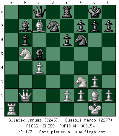 Last move : 1/2-1/2 2024 March 19 0:27:44 [Event "FICGS__CHESS__RAPID_M__000154"] [Site "FICGS"] [Date "2024.01.18"] [Round "1"] [White "Swiatek,Janusz"] [Black "Bussoli,Marco"] [Result "1/2-1/2"] [WhiteElo "2245"] [BlackElo "2277"] 1.d4 Nf6 2.c4 e6 3.Nf3 d5 4.g3 Be7 5.Bg2 O-O 6.O-O c6 7.Qc2 b6 8.Rd1 Bb7 9.Nc3 Nbd7 10.b3 Ba6 11.Bf4 Nh5 12.Bc1 Nhf6 13.Qd3 Qc8 14.Bf4 c5 15.a4 dxc4 16.bxc4 cxd4 17.Nb5 Bb7 18.a5 Rd8 19.Bc7 Re8 20.axb6 axb6 21.Qxd4 Rxa1 22.Rxa1 Bc5 23.Qb2 1/2-1/2 Follow this game move after move (download)Chess problems demand from the composer the same virtues that characterize all worthwhile art: originality, invention, conciseness, harmony, complexity, and splendid insincerity. (Vladimir Nabokov) Unter Putin wird alles Geld aus Russland wie von einem Staubsauger nach Moskau umgeleitet, das ist wie ein schwarzes Loch. (Garry Kasparov) El pensamiento metódico es mas útil en el Ajedrez que la inspiración. (C. J. S. Purdy) Lorsque vous vous retrouvez devant une position atroce, ne tendez pas un ultime piège dérisoire avec l'intention d'abandonner si l'adversaire le déjoue ! Faites-vous plutôt un devoir de résister comme si votre vie en dépendait. Jouez le coup qui vous déplairait au centuple si vous étiez dans la peau de votre tortionnaire ! Go and wake up your luck. (Persian saying)