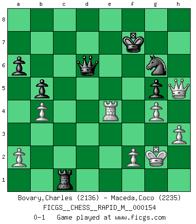 Last move : 0-1 2024 May 1 9:34:27 [Event "FICGS__CHESS__RAPID_M__000154"] [Site "FICGS"] [Date "2024.01.18"] [Round "1"] [White "Bovary,Charles"] [Black "Maceda,Coco"] [Result "0-1"] [WhiteElo "2136"] [BlackElo "2235"] 1.e4 c5 2.d4 cxd4 3.c3 dxc3 4.Nxc3 Nc6 5.Nf3 g6 6.Bc4 Bg7 7.O-O d6 8.e5 Nxe5 9.Nxe5 Bxe5 10.Qb3 e6 11.Re1 Bd7 12.Rxe5 dxe5 13.Be3 Bc6 14.Bc5 a6 15.Bxe6 fxe6 16.Qxe6+ Ne7 17.Qxe5 O-O 18.Bd4 Kf7 19.Re1 Ke8 20.Bb6 Qd7 21.b4 Rc8 22.h3 Kf7 23.Bd4 b6 24.Qg7+ Ke8 25.Bf6 Rxf6 26.Qxf6 b5 27.Qh8+ Kf7 28.Qxh7+ Kf6 29.g4 Rc7 30.Re3 Qd2 31.Ne4+ Bxe4 32.Rxe4 Qd1+ 33.Kh2 Qd6+ 34.Kg1 Rc1+ 35.Kg2 g5 36.Qh8+ Kf7 37.Qh5+ Ng6 0-1 Follow this game move after move (download)You have to have the fighting spirit. You have to force moves and take chances. (Bobby Fischer) Ein Isolani verdüstert die Stimmung auf dem ganzen Schachbrett. (Savielly Grigorievitsch Tartakower) Nada excita más a Grandes Maestros aburridos que una novedad teórica. (Dominic Lawson) Dans le domaine de la peinture, de la gravure et de la sculpture, dès la première décennie de notre siècle, les artistes abandonnent la représentation de la partie d'échecs pour se concentrer sur les pièces, sur les échiquiers et sur toutes les variations auxquelles les unes et les autres peuvent donner lieu. On passe en quelque sorte d'un thème social à un thème musical (au sens de la musica médiévale, c'est-à-dire d'une notion qui inclue le rythme, l'harmonie, la construction et la déconstruction, etc.). Graphiquement et picturalement, l'échiquier apparaît comme une structure ouverte, dynamique, d'une richesse infinie, autorisant toutes les combinatoires et débouchant sur des mouvements et des rythmes de nature exponentielle. (Michel Pastoureau) Imagination is more important than knowledge. Knowledge is limited. Imagination encircles the world. (Albert Einstein)