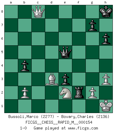 Last move : 1-0 2024 March 4 9:5:12 [Event "FICGS__CHESS__RAPID_M__000154"] [Site "FICGS"] [Date "2024.01.18"] [Round "1"] [White "Bussoli,Marco"] [Black "Bovary,Charles"] [Result "1-0"] [WhiteElo "2277"] [BlackElo "2136"] 1.e4 e5 2.Nf3 Nc6 3.Bb5 a6 4.Ba4 Nf6 5.O-O Nxe4 6.d4 b5 7.Bb3 d5 8.dxe5 Be6 9.c3 Bc5 10.Nbd2 O-O 11.Bc2 Nxf2 12.Rxf2 f6 13.Nf1 Bxf2+ 14.Kxf2 fxe5 15.Kg1 Qd7 16.a4 Kh8 17.Be3 Bg4 18.axb5 axb5 19.Rxa8 Rxa8 20.h3 Bxf3 21.Qxf3 e4 22.Qf4 Ne7 23.Bd1 Qd6 24.Qf2 Qf6 25.Qg3 Nf5 26.Qxc7 Nxe3 27.Nxe3 d4 28.cxd4 Qxd4 29.Qc1 Rd8 30.Kh2 b4 31.Ba4 Qb6 32.Bb3 h6 33.Kh1 Qd4 34.Nf5 Qb6 35.Ne3 Qd6 36.Nf5 Qf6 37.Ng3 Qe5 38.Ne2 e3 39.Bc4 Rf8 40.Bd3 Rf2 41.Qc8+ 1-0 Follow this game move after move (download)No Chess Grandmaster is normal; they only differ in the extent of their madness. (Viktor Korchnoi) Kostenjuk hat keinen Sexappeal. (Loek van Wely) El Ajedrez es realmente noventa y nueve por ciento calculación. (Soltis) Je fais ceci parce que dans cinquante coups j'obtiendrai cela; je m'appelle Mikhail Moisevitch Botvinnik. (Botvinnik) Experiences are the keys to life. (Daniel Parmet)