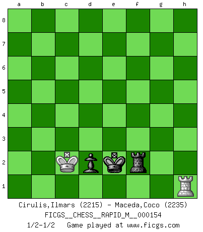 Last move : 1/2-1/2 2024 June 8 20:38:22 [Event "FICGS__CHESS__RAPID_M__000154"] [Site "FICGS"] [Date "2024.01.18"] [Round "1"] [White "Cirulis,Ilmars"] [Black "Maceda,Coco"] [Result "1/2-1/2"] [WhiteElo "2215"] [BlackElo "2235"] 1.e4 c5 2.d4 cxd4 3.Qxd4 Nc6 4.Qd3 Nf6 5.Nc3 e6 6.Bf4 a6 7.O-O-O b5 8.e5 Qc7 9.Qf3 Ng8 10.Ne4 Bb7 11.Nd6+ Bxd6 12.exd6 Qa5 13.Qg3 Kf8 14.Kb1 Nf6 15.Bd2 Ne4 16.Bxa5 Nxg3 17.hxg3 Nxa5 18.a4 Bc6 19.Nf3 f6 20.Nd4 Rb8 21.Kc1 bxa4 22.Nxc6 Nxc6 23.Rh4 a3 24.bxa3 Rb6 25.Rd3 Kf7 26.Rb3 Rhb8 27.Rxb6 Rxb6 28.Ra4 a5 29.Be2 f5 30.Bf3 e5 31.Bxc6 Rxc6 32.Rxa5 Ke6 33.a4 g6 34.Ra8 Kxd6 35.Kd2 Kd5 36.Rh8 h5 37.Rh7 Ke6 38.Rg7 Rd6+ 39.Kc3 Kd5 40.Kb4 Kc6 41.c4 Kc7 42.a5 Rd2 43.Rxg6 Rxf2 44.Rf6 e4 45.a6 e3 46.Kc3 Kb8 47.Rh6 Ka7 48.Rxh5 Kxa6 49.Kd3 e2 50.Kd2 Kb6 51.Rh7 d6 52.Rf7 Kc5 53.g4 Rxg2 54.Rxf5+ Kxc4 55.Rf6 d5 56.Rc6+ Kd4 57.Rc1 Rxg4 58.Kxe2 Re4+ 59.Kd2 Rh4 60.Rd1 Rh2+ 61.Kc1 Kc4 62.Re1 d4 63.Re8 Kd3 64.Rg8 Rh1+ 65.Kb2 Rf1 66.Rg3+ Ke2 67.Kc2 Ra1 68.Rg2+ Ke3 69.Rg3+ Ke4 70.Rg4+ Kd5 71.Rg5+ Kc4 72.Rg3 Ra2+ 73.Kb1 Re2 74.Kc1 Re3 75.Rg7 Kd3 76.Kd1 Rf3 77.Kc1 Rf1+ 78.Kb2 Rf2+ 79.Kb3 Ke2 80.Re7+ Kd2 81.Rh7 d3 82.Kb2 Ke1 83.Kc3 d2 84.Rh1+ Ke2 85.Kc2 Rf1 86.Rh2+ Rf2 87.Rh1 1/2-1/2 Follow this game move after move (download)There are two classes of men; those who are content to yield to circumstances and who play whist; those who aim to control circumstances, and who play Chess. (Mortimer Collins) Du musst nicht gut spielen, es reicht, wenn du besser spielst als dein Gegner. (Anonymous) Una de estas pequeñas movidas modestas pudieran ser mas molestas a tu oponente que la amenaza mas grande. (Siegbert Tarrasch) Soyez une menace à chaque fois que vous vous asseyez pour jouer. (Ken Smith) I believe in luck. How else can you explain the success of those you dislike ? (Jean Cocteau)