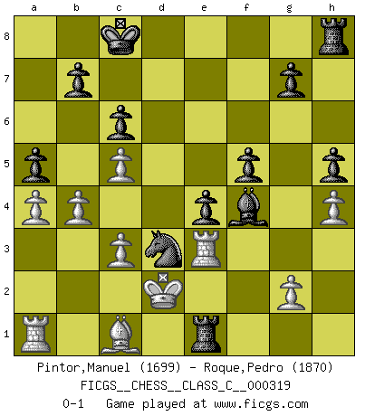 Last move : 0-1 2024 May 17 0:0:20 [Event "FICGS__CHESS__CLASS_C__000319"] [Site "FICGS"] [Date "2024.01.21"] [Round "1"] [White "Pintor,Manuel"] [Black "Roque,Pedro"] [Result "0-1"] [WhiteElo "1699"] [BlackElo "1870"] 1.e4 h5 2.f4 d5 3.exd5 Qxd5 4.d4 Qe4+ 5.Qe2 Qxe2+ 6.Bxe2 Bf5 7.Bf3 c6 8.c3 Nf6 9.Nd2 Nbd7 10.Ne2 e6 11.O-O Bd3 12.Re1 Bd6 13.Nb3 a5 14.a4 Nd5 15.h4 Bc4 16.Nd2 Bxe2 17.Rxe2 Nxf4 18.Re3 Bc7 19.Ne4 e5 20.Ng5 f6 21.Ne4 O-O-O 22.Nc5 Nxc5 23.dxc5 f5 24.b4 e4 25.Bd1 Rxd1+ 26.Kf2 Nd3+ 27.Ke2 Re1+ 28.Kd2 Bf4 0-1 Follow this game move after move (download)I'm not afraid of Spassky. The world knows I'm the best. You don't need a match to prove it. (Bobby Fischer) Ich möchte Schüler heranbilden, die das Vermögen haben, selbst zu denken und Kritik zu üben. (Emanuel Lasker) Ciertamente, de todas la drogas del mundo, el Ajedrez debe ser el mas placentero permamentemente. (Assiac) Aidez vos pièces, elles vous aideront. (Paul Morphy) If you are going through hell, keep going. (Winston Churchill)
