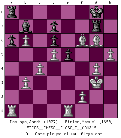 Last move : 1-0 2024 February 3 5:10:53 [Event "FICGS__CHESS__CLASS_C__000319"] [Site "FICGS"] [Date "2024.01.21"] [Round "1"] [White "Domingo,Jordi"] [Black "Pintor,Manuel"] [Result "1-0"] [WhiteElo "1927"] [BlackElo "1699"] 1.e4 e5 2.Nf3 Nc6 3.Bc4 Qf6 4.Nc3 Qg6 5.O-O Nf6 6.Nb5 Bd6 7.d4 a6 8.Nxd6+ cxd6 9.Re1 O-O 10.d5 Ne7 11.Nh4 Qh5 12.Qxh5 Nxh5 13.a4 Nf4 14.g3 Nfg6 15.Nxg6 Nxg6 16.b3 f5 17.exf5 Nh8 18.Bd3 h6 19.a5 Rf6 20.Kg2 Nf7 21.g4 Nh8 22.h4 g6 23.Bxh6 gxf5 24.Bg5 Rf7 25.Bxf5 b5 26.axb6 Bb7 27.c4 Rg7 28.Kg3 Nf7 29.Be3 Nh6 30.Bxh6 Rf7 31.h5 Rf6 32.Bg5 Rf7 33.Bg6 Rg7 34.Bf6 1-0 Follow this game move after move (download)The older I grow, the more I value Pawns. (Keres) Die jungen Leute sollen verstehen, dass sie noch etwas von mir lernen können und müssen. (Viktor Kortschnoi) El jugador de combinación piensa hacia adelante; comienza de la posición dada y trabaja las movidas contundentes en su mente. (Emanuel Lasker) Vous n'êtes pas toujours obligé de jouer le meilleur coup. Un coup doit être actif, entreprenant, correct et beau ! (David Bronstein) Nothing is more important for teaching us to understand the concepts we have than constructing fictitious ones. (Ludwig Wittgenstein)