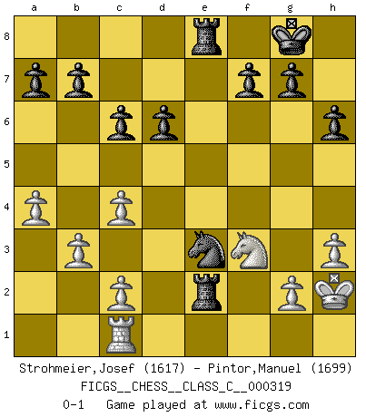 Last move : 0-1 2024 April 1 23:16:49 [Event "FICGS__CHESS__CLASS_C__000319"] [Site "FICGS"] [Date "2024.01.21"] [Round "1"] [White "Strohmeier,Josef"] [Black "Pintor,Manuel"] [Result "0-1"] [WhiteElo "1617"] [BlackElo "1699"] 1.e4 e5 2.Nf3 Nc6 3.Bb5 Qf6 4.Nc3 Qg6 5.O-O Nf6 6.d3 h6 7.Nh4 Qh5 8.Qxh5 Nxh5 9.Nf5 Bc5 10.Be3 Nd4 11.Bxd4 exd4 12.Ne2 O-O 13.Nfxd4 c6 14.Bc4 d6 15.f4 Bg4 16.Kh1 Rfe8 17.Nf3 Be3 18.h3 Be6 19.f5 Bxc4 20.dxc4 Rxe4 21.b3 Bb6 22.Nfg1 Bxg1 23.Nxg1 Ng3+ 24.Kh2 Nxf1+ 25.Kh1 Ng3+ 26.Kh2 Nxf5 27.Nf3 Rae8 28.Rc1 Re2 29.a4 Ne3 0-1 Follow this game move after move (download)I like to say that Bobby Fischer was the greatest player ever. But what made Fischer a genius was his ability to blend an American freshness and pragmatism with Russian ideas about strategy. (Bruce Pandolfini) Kann Schach nicht schließlich das Nationalspiel der Deutschen werden? Und welche weiteren Ausblicke bieten sich dann dar! Welche Hebung des allgemeinen Kultur-Niveaus, ja der Moral, wenn das Schachbrett den Kartentisch verdrängen würde! Wahrlich, ein Ziel, des Schweißes der Edlen wert! (Siegbert Tarrasch) Los Peones son nacidos libres, y aún así, se encuentran encadenados por todos lados. (Rick Kennedy) Que feriez-vous si vous étiez en train de jouer aux échecs et que la fin du monde arrive ? Je continuerais à jouer. (Saint Borromée) Follow your passion, and success will follow you. (Arthur Buddhold)