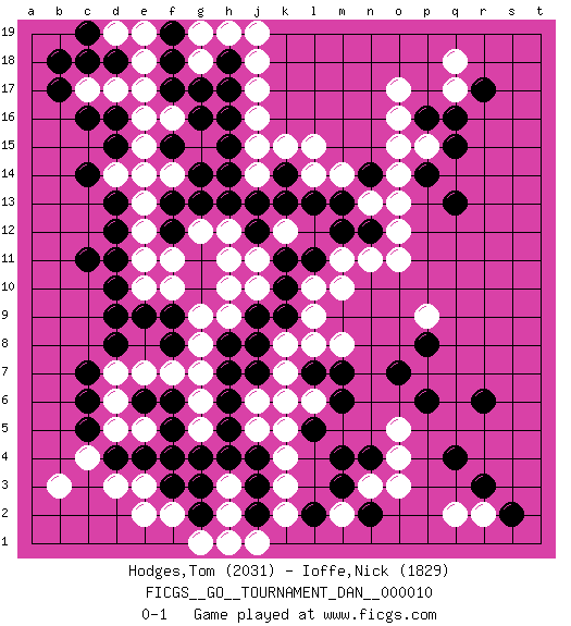 Last move : 0-1 2007 December 2 22:41:17 [Event "FICGS__GO__TOURNAMENT_DAN__000010"] [Site "FICGS"] [Date "2007.09.12"] [Round "1"] [Black "Hodges,Tom"] [White "Ioffe,Nick"] [Result "0-1"] [Rating 1 "2031"] [Rating 2 "1829"] 1.c16 e16 2.q4 q17 3.q15 p15 4.p14 o15 5.q16 o17 6.r17 q18 7.p16 o16 8.q13 d14 9.c14 c4 10.e4 e3 11.f3 d3 12.g4 k3 13.c5 d5 14.d4 b3 15.c6 e5 16.f4 e7 17.d8 g6 18.h5 o3 19.h6 g8 20.c11 o5 21.r6 c17 22.b17 d17 23.n4 n3 24.m4 o4 25.m3 k5 26.f6 f7 27.e6 d6 28.f5 d7 29.c7 e10 30.d9 e12 31.d13 e13 32.d12 f10 33.m6 k7 34.h8 h9 35.j8 l8 36.j9 h10 37.k10 m10 38.l11 n11 39.k6 l6 40.l5 j6 41.h7 g7 42.o7 q2 43.m7 m8 44.r3 p9 45.p8 r2 46.s2 m2 47.l2 k2 48.n2 n13 49.l13 l15 50.l7 k8 51.k6 j5 52.j7 l6 53.p6 k6 54.j12 j14 55.j4 k4 56.j3 h2 57.j2 j1 58.g2 h3 59.h4 e2 60.n12 o12 61.m12 o11 62.k14 j10 63.k9 k15 64.j13 k12 65.h14 j15 66.g13 g12 67.g16 f14 68.h15 j17 69.f15 e15 70.h17 j18 71.f17 j11 72.k11 h12 73.h13 g18 74.h18 e17 75.n14 o14 76.f18 h19 77.g14 f16 78.f13 e14 79.f12 f11 80.d11 e11 81.b18 e18 82.f19 g19 83.c18 d19 84.g11 h11 85.g10 g9 86.e9 l14 87.m13 o13 88.k13 m14 89.f9 j16 90.h16 j19 91.g17 f2 92.g3 h1 93.d15 g1 94.d10 m11 95.d18 e19 96.c19 l10 97.d16 l9 98.f8 g5 0-1 Here are the names of the openings (joseki) played in the four corners : Corner d16 : c16 e16 Komoku (Somok, Xiao~mu`) 3-4 Point. The komoku (3-4) point is the traditional corner enclosure move.. Ikken Takagakari (Hankan Nop'dakeolch'im, Yi Gaogua`jiao~, 1-Space High Approach). The 5-4 approach move has become more popular in modern times, as modern Go emphasizes speed and influence. Corner q16 : q17 q15 Komoku (Somok, Xiao~mu`) 3-4 Point. The komoku (3-4) point is the traditional corner enclosure move.. Ikken Takagakari (Hankan Nop'dakeolch'im, Yi Gaogua`jiao~, 1-Space High Approach). The 5-4 approach move has become more popular in modern times, as modern Go emphasizes speed and influence. Corner d4 : c4 e4 Komoku (Somok, Xiao~mu`) 3-4 Point. The komoku (3-4) point is the traditional corner enclosure move.. Ikken Takagakari (Hankan Nop'dakeolch'im, Yi Gaogua`jiao~, 1-Space High Approach). The 5-4 approach move has become more popular in modern times, as modern Go emphasizes speed and influence. Corner q4 : q4 o3 Hoshi (Hwajeom, Seongjeom, Xingwei`) 4-4 Point. The star or hoshi (4-4) point, emphasizing influence at the potential expense of territory. Ikken Kakari (Hankan Keolch'im, Yi Gua`jiao~, 1-Space Low Approach). White 2 is the standard approach move to the 4-4. Player White won this Go (weiqi, baduk) game. Follow this game move after move (download)Don't defend - extend ! (Bill Taylor) There are three kinds of lies: lies, damned lies and statistics. (Mark Twain)