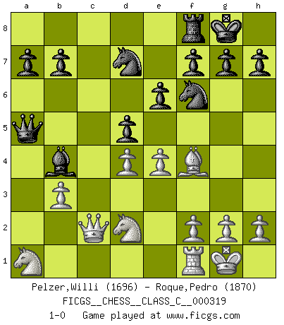 Last move : 1-0 2024 August 1 4:49:52 [Event "FICGS__CHESS__CLASS_C__000319"] [Site "FICGS"] [Date "2024.01.21"] [Round "1"] [White "Pelzer,Willi"] [Black "Roque,Pedro"] [Result "1-0"] [WhiteElo "1696"] [BlackElo "1870"] 1.d4 Nf6 2.Bf4 e6 3.Nf3 c5 4.e3 d5 5.Bb5+ Bd7 6.Bxd7+ Nbxd7 7.c3 Qb6 8.b3 Rc8 9.O-O Be7 10.Nbd2 cxd4 11.cxd4 Ba3 12.Rb1 Qa5 13.Ne1 O-O 14.Nc2 Be7 15.a3 Qc3 16.Rc1 Qb2 17.Na1 Qxa3 18.Rc2 Qa5 19.Qb1 Rxc2 20.Qxc2 Bb4 21.e4 1-0 Follow this game move after move (download)On the chessboard, lies and hypocrisy do not survive long. (Emanuel Lasker) Stelle das Brett so, daß die Sonne in die Augen deines Gegners scheint. (Ruy López) Yo siempre he tenido un ligero sentimiento de lástima por una persona que no tiene conocimiento del Ajedrez. (Siegbert Tarrasch) En blitz, le Cavalier l'emporte sur le Fou. (Vlastimil Hort) Success without honor is an unseasoned dish; it will satisfy your hunger, but it won't taste good. (Joe Paterno)