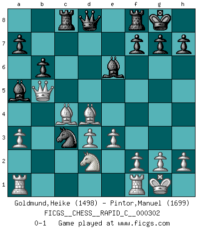 Last move : 0-1 2024 March 15 10:8:9 [Event "FICGS__CHESS__RAPID_C__000302"] [Site "FICGS"] [Date "2024.01.21"] [Round "1"] [White "Goldmund,Heike"] [Black "Pintor,Manuel"] [Result "0-1"] [WhiteElo "1498"] [BlackElo "1699"] 1.b4 e5 2.Bb2 Nc6 3.b5 Nd4 4.e3 Nf5 5.Bxe5 Nf6 6.Nf3 Bd6 7.Bb2 O-O 8.c4 Bb4 9.a3 Ba5 10.Be2 d5 11.O-O c6 12.Qc2 dxc4 13.Bxc4 cxb5 14.Bxb5 Be6 15.Nd4 Nxd4 16.Bxd4 Rc8 17.Qb2 b6 18.d3 Nd5 19.Nd2 Nc3 20.Bc4 Na4 21.Qb5 Nc3 0-1 This chess game has been lost on time (started : 2024.01.21 0:34:44) Follow this game move after move (download)What is the difference between chess and football? Everybody understands football, but nobody plays it. Everybody plays chess, but nobody understands it. Everything is relative. (Vladimir Kramnik) Man wirke der falschen Auffassung entgegen, als ob jeder Zug Unmittelbares zu leisten habe; auch Werte- und Ruhezüge haben ihre Existenzberechtigung. (Aaron Nimzowitsch) Hay dos clases de hombres: aquellos que se conforman en dejarse llevar por las circunstancias y que juegan barajas y aquellos decididos a controlar las circunstancias y que juegan al Ajedrez. (Mortimer Collins) Roi des jeux et jeu des rois, les échecs portent en eux un sentiment d'infini. Ils donnent à celui qui s'est efforcé d'en approfondir les arcanes l'impression de n'être pas à la mesure de l'homme; en fait, ils constituent un résumé de l'univers, un microcosme, et figurent cette grande échelle qui, dans les plans de la lumière descend jusqu'à la matière, qui des abîmes insondables remonte jusqu'en l'infini de Dieu. (Pyrame) We cannot be sure of having something to live for unless we are willing to die for it. (Ernesto Che Guevara)