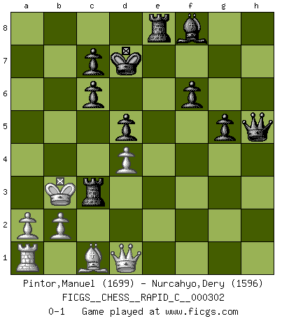 Last move : 0-1 2024 March 7 6:41:51 [Event "FICGS__CHESS__RAPID_C__000302"] [Site "FICGS"] [Date "2024.01.21"] [Round "1"] [White "Pintor,Manuel"] [Black "Nurcahyo,Dery"] [Result "0-1"] [WhiteElo "1699"] [BlackElo "1596"] 1.e4 f6 2.f4 e6 3.f5 exf5 4.exf5 g6 5.d4 d5 6.Bd3 Ne7 7.fxg6 hxg6 8.Nf3 Nbc6 9.O-O Bg4 10.c3 Qd6 11.g3 O-O-O 12.Qa4 g5 13.Na3 Nf5 14.Nb5 Qe6 15.Re1 Qf7 16.Nxa7+ Kd7 17.Bb5 Nfe7 18.Nxc6 bxc6 19.Be2 Qh7 20.Kf2 Bxf3 21.Bxf3 Qxh2+ 22.Bg2 Rh3 23.Re3 Nf5 24.Qd1 Nxe3 25.Kxe3 Rxg3+ 26.Bf3 Re8+ 27.Kd3 Qh5 28.Kc2 Rxf3 29.Kb3 Rxc3+ 0-1 Follow this game move after move (download)Human affairs are like a Chess game: only those who do not take it seriously can be called good players. (Hung Tzu Ch'eng) Die unerbitterlichsten Regeln im Schach sind die Ausnahmen. (Savielly Grigorievitsch Tartakower) Cada Peón es potencialmente una Reina. (James Mason) Les pièces de l'échiquier étaient impitoyables. Elles le retenaient, elles l'absorbaient. Il y avait de l'horreur en cela, mais aussi une harmonie unique. Car, qu'y a-t-il dans le monde, à part les échecs ? (V. Nabokov) If everyone is thinking alike, then somebody isn't thinking. (US General George S. Patton)