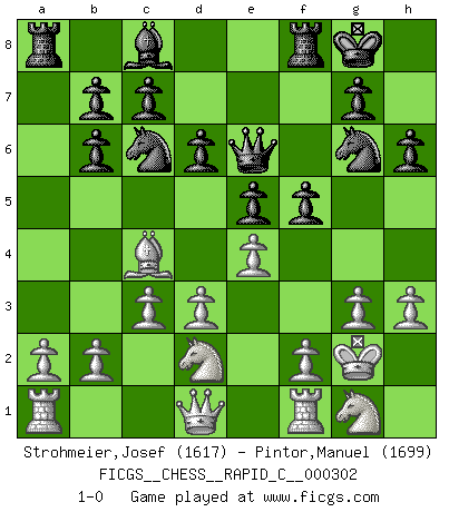 Last move : 1-0 2024 February 8 0:0:49 [Event "FICGS__CHESS__RAPID_C__000302"] [Site "FICGS"] [Date "2024.01.21"] [Round "1"] [White "Strohmeier,Josef"] [Black "Pintor,Manuel"] [Result "1-0"] [WhiteElo "1617"] [BlackElo "1699"] 1.e4 e5 2.Nf3 Nc6 3.Bb5 Bc5 4.O-O Qf6 5.c3 Nge7 6.d3 h6 7.Be3 Bb6 8.Bxb6 axb6 9.Nbd2 O-O 10.h3 Ng6 11.g3 d6 12.Kg2 Qe6 13.Ng1 f5 14.Bc4 1-0 Follow this game move after move (download)Any material change in a position must come about by mate, a capture, or a Pawn promotion. (Purdy) Die meiste Zeit treffe ich auf Gegner, die meine Enkel sein könnten. Ich bin da, um ihnen zu zeigen, dass sie von mir noch einiges lernen können. (Viktor Kortschnoi) El Ajedrez es una hermosa aventura. (Bent Larsen) Aux échecs, les retours au sommet sont rares : les dommages psychologiques consécutifs à une défaite sont trop sévères. (Daily Telegraph) The existence of forgetting has never been proved: We only know that some things don't come to mind when we want them. (Friedrich Nietzsche)