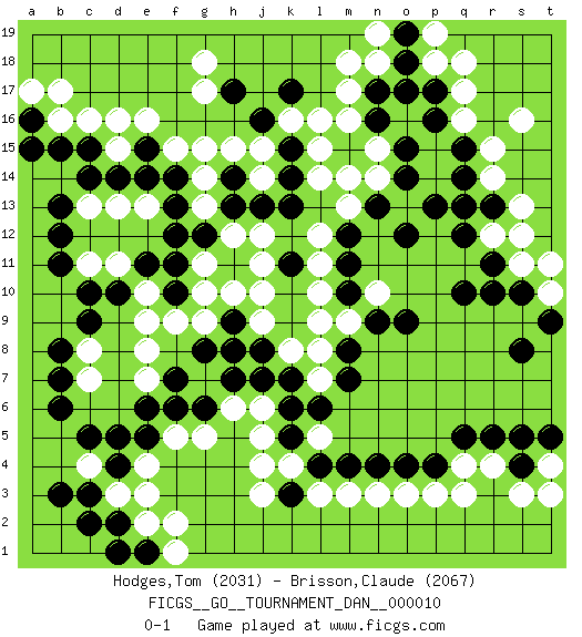 Last move : 0-1 2008 January 15 15:36:37 [Event "FICGS__GO__TOURNAMENT_DAN__000010"] [Site "FICGS"] [Date "2007.09.12"] [Round "1"] [Black "Hodges,Tom"] [White "Brisson,Claude"] [Result "0-1"] [Rating 1 "2031"] [Rating 2 "2067"] 1.r5 d16 2.d4 r15 3.d10 q17 4.k17 q3 5.p4 p3 6.o4 o3 7.n4 m3 8.q10 c7 9.c9 c4 10.c3 d3 11.b3 e4 12.d5 e3 13.c5 e7 14.e5 f5 15.f6 g5 16.f7 g17 17.n17 r12 18.r10 e9 19.e6 e8 20.f11 g9 21.c14 l5 22.m4 l3 23.l4 k4 24.k5 j5 25.k6 j6 26.k7 d13 27.d14 e13 28.b12 c11 29.b11 c13 30.b13 e10 31.e11 d11 32.c10 g11 33.f12 g13 34.g12 h12 35.h11 g10 36.h13 j12 37.f13 g14 38.f14 f15 39.e14 c16 40.h14 g15 41.k14 j10 42.k11 j11 43.q12 m17 44.n16 m16 45.m15 k16 46.j16 j15 47.k15 j14 48.j13 h15 49.r13 q13 50.p13 s13 51.q14 l9 52.m8 m9 53.n9 n10 54.o9 l16 55.h17 n18 56.o18 m18 57.p17 q18 58.q15 l15 59.k13 l14 60.m11 l12 61.m10 l11 62.m12 m13 63.o12 q16 64.p16 g18 65.b15 b16 66.b6 l8 67.m7 r4 68.s4 q4 69.q5 s3 70.s5 r14 71.n13 n15 72.o15 n14 73.o14 m14 74.b7 c8 75.b8 s11 76.s10 t10 77.t9 t11 78.s8 t3 79.r11 q13 80.k3 j4 81.r13 s12 82.a16 a17 83.a15 b17 84.j8 l10 85.d2 e2 86.c2 l7 87.l6 n3 88.e1 f1 89.d1 f2 90.e15 e16 91.h9 h10 92.g6 j9 93.h8 k8 94.j7 h6 95.g8 p18 96.o19 t4 97.t5 p19 98.f10 f9 99.h7 n19 100.o17 j3 101.q13 s16 102.c15 d15 0-1 Here are the names of the openings (joseki) played in the four corners : Corner q4 : r5 q3 Mokuhazushi (Waemok, Wai`mu`) 5-3 Point. The mokuhazushi (5-3) point was popular in the Edo period in Japan (1600 - 1867). It emphasizes influence; territorially, it is inferior to the 3-4 point. Komoku Kakari. White 2 is the standard approach because of its solidity and stability. Corner d4 : d4 c7 Hoshi (Hwajeom, Seongjeom, Xingwei`) 4-4 Point. The star or hoshi (4-4) point, emphasizing influence at the potential expense of territory. Nikken Kakari (Dukan Keolch'im, E`r Gua`jiao~, 2-Space Low Approach). Black typically answers by 7-3 or 3-5 (which is not joseki). Player White won this Go (weiqi, baduk) game. Follow this game move after move (download)Studying go is a wonderful way to develop both the creative as well as the logical abilities of children because to play it both sides of the brain are necessary. (Cho Chikun) A computer lets you make more mistakes faster than any invention in human history - with the possible exceptions of handguns and tequila. (Mitch Ratcliffe)