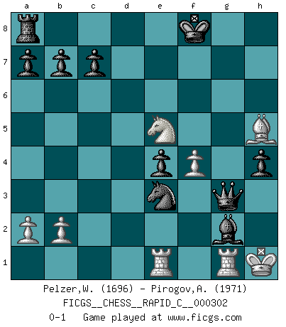 Last move : 0-1 2024 April 9 10:18:17 [Event "FICGS__CHESS__RAPID_C__000302"] [Site "FICGS"] [Date "2024.01.21"] [Round "1"] [White "Pelzer,Willi"] [Black "Pirogov,Andrey Mikhaylovich"] [Result "0-1"] [WhiteElo "1696"] [BlackElo "1971"] 1.d4 Nf6 2.c4 e6 3.Bg5 h6 4.Bh4 g5 5.Bg3 h5 6.h3 Ne4 7.Qd3 Nxg3 8.Qxg3 Nc6 9.e3 Nb4 10.Na3 d5 11.Nf3 f6 12.Be2 Bd6 13.Ne5 fxe5 14.dxe5 h4 15.Qg4 Bxe5 16.Rb1 Qe7 17.O-O Bh2+ 18.Kxh2 e5 19.Qh5+ Rxh5 20.Bxh5+ Kf8 21.f4 gxf4 22.exf4 e4 23.cxd5 Nxd5 24.Nc4 Qg7 25.Ne5 Qg3+ 26.Kh1 Ne3 27.Rg1 Bxh3 28.Rbe1 Bxg2+ 0-1 This chess game has been lost on time (started : 2024.01.21 0:34:44) Follow this game move after move (download)Bobby Fischer is the greatest Chess genius of all time ! (Alexander Kotov) Charakterschwächen offenbaren sich normalerweise während einer Schachpartie. (Garry Kasparov) Me siento como si fuera una pieza en una partida de Ajedrez, cuando mi oponente me indica: esa pieza no puede ser movida. (Soren Kierkegaard) Le génie consiste à savoir transgresser les règles au moment opportun. (Teichmann) Gambling is the son of avarice and the father of despair. (French proverb)