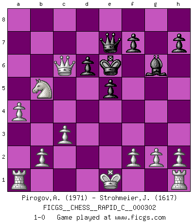 Last move : 1-0 2024 April 4 9:30:12 [Event "FICGS__CHESS__RAPID_C__000302"] [Site "FICGS"] [Date "2024.01.21"] [Round "1"] [White "Pirogov,Andrey Mikhaylovich"] [Black "Strohmeier,Josef"] [Result "1-0"] [WhiteElo "1971"] [BlackElo "1617"] 1.e4 c5 2.Nf3 Nc6 3.d4 cxd4 4.Nxd4 Nf6 5.Nc3 e6 6.Ndb5 d6 7.Bf4 e5 8.Bg5 a6 9.Na3 b5 10.Nd5 Be6 11.Bxf6 gxf6 12.c3 f5 13.exf5 Bxf5 14.Qf3 Qc8 15.Nb6 Qb7 16.Nxa8 Bg6 17.Bxb5 axb5 18.Nxb5 Be7 19.Nac7+ Kf8 20.a4 Bd8 21.Ne6+ Ke7 22.Nxd8 Kxd8 23.Qf6+ Qe7 24.Qxh8+ Kd7 25.Qa8 Ke6 26.Qxc6 1-0 Follow this game move after move (download)Discovered check is the dive bomber of the Chessboard. (Reuben Fine) Man kann eine Schachpartie nur gewinnen, wenn das Gleichgewicht gestört ist. In einer Stellung mit ungestörtem Gleichgewicht ist auch das größte Genie hilflos - in der Stellung steckt dann eben kein genialer Einfall. (Wilhelm Steinitz) Yo siempre he tenido un ligero sentimiento de lástima por una persona que no tiene conocimiento del Ajedrez. (Siegbert Tarrasch) Les Cavaliers se révèlent fort utiles dans les positions fermées. D'habitude, les Fous sont un peu plus forts que les Cavaliers dans les positions ouvertes. Qu'on le veuille ou non, il restera toujours des exceptions ! I feel so... helpless. (C-3PO in Star Wars ep.3)