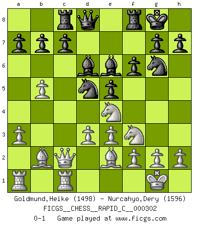 Last move : 0-1 2024 March 28 15:23:5 [Event "FICGS__CHESS__RAPID_C__000302"] [Site "FICGS"] [Date "2024.01.21"] [Round "1"] [White "Goldmund,Heike"] [Black "Nurcahyo,Dery"] [Result "0-1"] [WhiteElo "1498"] [BlackElo "1596"] 1.b4 f6 2.Bb2 e5 3.a3 Nc6 4.b5 Nd4 5.e3 Ne6 6.c4 Ne7 7.d3 Ng6 8.Nf3 Be7 9.Be2 O-O 10.Nbd2 d5 11.Qb3 Nc5 12.Qc3 Be6 13.O-O Na4 14.Qc2 Nb6 15.cxd5 Nxd5 16.Rfc1 Bd6 17.Ne4 Rc8 0-1 This chess game has been lost on time (started : 2024.01.21 0:34:44) Follow this game move after move (download)It is the aim of the modern school, not to treat every position according to one general law, but according to the principle inherent in the position. (Richard Reti) Ich möchte Schüler heranbilden, die das Vermögen haben, selbst zu denken und Kritik zu üben. (Emanuel Lasker) Un entendimiento a fondo de las continuaciones típicas del mate, hace de las combinaciones de sacrificio mas complicadas conducirlas a ellas no solo sin dificultad, sino casi de una manera natural. (Siegbert Tarrasch) Psychologiquement, tu dois avoir confiance en toi même, mais cette confiance doit être basée sur des faits. (Robert Fischer) A person who never made a mistake never tried anything new. (Albert Einstein)