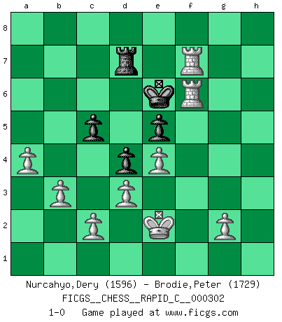 Last move : 1-0 2024 May 3 20:1:25 [Event "FICGS__CHESS__RAPID_C__000302"] [Site "FICGS"] [Date "2024.01.21"] [Round "1"] [White "Nurcahyo,Dery"] [Black "Brodie,Peter"] [Result "1-0"] [WhiteElo "1596"] [BlackElo "1729"] 1.f3 e5 2.Nc3 Nf6 3.e4 d6 4.Bc4 Be6 5.Bxe6 fxe6 6.Qe2 Be7 7.Qb5+ Nc6 8.Qxb7 Nd4 9.Kd1 Nd7 10.Nge2 Qb8 11.Qxb8+ Rxb8 12.Nxd4 exd4 13.Ne2 e5 14.d3 O-O 15.b3 c5 16.Ng3 Nf6 17.Nf5 Rbe8 18.Bg5 h6 19.Bd2 Bd8 20.Nxd6 Re6 21.Nb5 a6 22.Na3 R6e8 23.Nc4 Bc7 24.Ke2 g5 25.h4 gxh4 26.Rxh4 h5 27.Bg5 Bd8 28.Nd6 Re6 29.Nf5 Nxe4 30.fxe4 Bxg5 31.Rxh5 Bf6 32.Rah1 Rb8 33.R1h3 Rb7 34.Rg3+ Bg7 35.Nh6+ Rxh6 36.Rxh6 Kf8 37.Rxa6 Kf7 38.a4 Bf6 39.Rf3 Ke7 40.Raxf6 Rd7 41.Rf7+ Ke6 42.R3f6+ 1-0 Follow this game move after move (download)All I want to do, ever, is just play Chess. (Bobby Fischer) Ich trinke, ich rauche, ich spiele, ich liebe Frauen aber Fernschach ist ein Laster, das ich nicht habe. (Mikhail Nekhemyevich Tal) Si un gobernante no entiende al Ajedrez, ¿como puede governar él un reinado?. (El Rey Khusros II) Il vaut mieux sacrifier les pièces de l'adversaire. (Xavier Tartacover) Children in the dark cause accidents, accidents in the dark cause children. (Unknown)