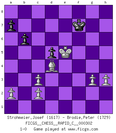 Last move : 1-0 2024 May 7 17:5:49 [Event "FICGS__CHESS__RAPID_C__000302"] [Site "FICGS"] [Date "2024.01.21"] [Round "1"] [White "Strohmeier,Josef"] [Black "Brodie,Peter"] [Result "1-0"] [WhiteElo "1617"] [BlackElo "1729"] 1.e4 e6 2.d4 d5 3.Nc3 Bb4 4.e5 Bxc3+ 5.bxc3 Nd7 6.Nf3 h6 7.Be2 g5 8.O-O f6 9.h3 fxe5 10.dxe5 Ne7 11.Nd4 Nxe5 12.Bh5+ Nf7 13.Bxf7+ Kxf7 14.f4 Kg6 15.Qd3+ Kg7 16.fxg5 hxg5 17.Bxg5 Rh5 18.Bf6+ Kh6 19.Qe3+ Kg6 20.Nxe6 Bxe6 21.Qxe6 Qd6 22.Qxd6 cxd6 23.Bxe7 Rf5 24.Bxd6 Rd8 25.Bc5 b6 26.Bd4 Rdf8 27.Rxf5 Rxf5 28.Rf1 Rxf1+ 29.Kxf1 Kf5 30.Kf2 Ke4 31.g3 Kf5 32.Kf3 Kg6 33.Kf4 Kf7 34.Ke5 1-0 Follow this game move after move (download)The passed pawn is a criminal, who should be kept under lock and key. Mild measures, such as police surveillance, are not sufficient. (Nimzovitch) Offensichtlich kennt Kasparow nichts anderes als Schach, und ich könnte 500 weitere Spieler dieser Sorte benennen. (Judith Polgar) Fischer deseaba darle a los Rusos una sopa de su propia medicina. (Larry Evans) Fischer est le meilleur joueur du monde et Karpov n'est qu'un joueur de bistrot. (Garry Kasparov, agé de 16 ans) Information on the Internet is subject to the same rules and regulations as conversation at a bar. (George Lundberg)