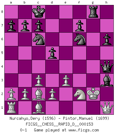 Last move : 0-1 2024 February 26 12:59:36 [Event "FICGS__CHESS__RAPID_D__000153"] [Site "FICGS"] [Date "2024.01.21"] [Round "1"] [White "Nurcahyo,Dery"] [Black "Pintor,Manuel"] [Result "0-1"] [WhiteElo "1596"] [BlackElo "1699"] 1.f3 e5 2.Nc3 Bc5 3.Ne4 Bxg1 4.Rxg1 Qh4+ 5.Nf2 Qxh2 6.Rh1 Qg3 7.Rh3 Qg6 8.Nh1 d5 9.Rg3 Qh5 10.Nf2 Qh4 11.Rxg7 h6 12.e3 Nc6 13.c3 Be6 14.Bd3 O-O-O 15.Ke2 Nf6 16.g4 e4 17.Bc2 exf3+ 18.Kxf3 Rhg8 19.Rxg8 Rxg8 20.Qh1 Bxg4+ 21.Kg2 Bh3+ 0-1 Follow this game move after move (download)He who fears an isolated Queen's Pawn should give up Chess. (Siegbert Tarrasch) Als er Schachweltmeister wurde ließ er praktisch alle stärksten Sovietspieler für sich arbeiten. Wenn ein auch nur mittelmässiger Meister ein Spezialist für eine bestimmte Eröffnung war, wurde er von Karpov gerufen. Das wurde alles geheim gehalten. (Mikhail Moiseyevich Botvinik) No hay precio que sea tan grande por la cabellera del Rey enemigo. (Koblentz) Il s'avisa de me proposer d'apprendre les échecs qu'il jouait un peu... me voilà forcené des échecs. J'achète un échiquier, je m'enferme dans ma chambre, j'y passe des jours et des nuits à vouloir apprendre par cur toutes les parties. (Jean-Jacques Rousseau, Confessions) Whoever said the pen is mightier than the sword obviously never encountered automatic weapons. (US General Douglas MacArthur)