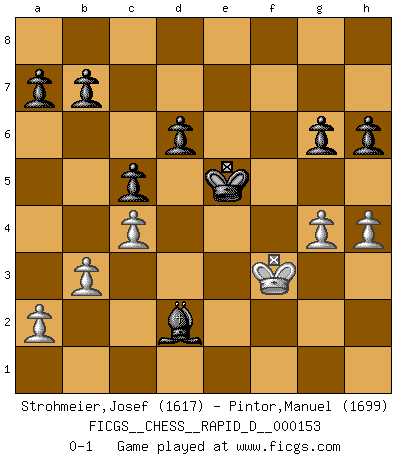 Last move : 0-1 2024 April 13 21:57:16 [Event "FICGS__CHESS__RAPID_D__000153"] [Site "FICGS"] [Date "2024.01.21"] [Round "1"] [White "Strohmeier,Josef"] [Black "Pintor,Manuel"] [Result "0-1"] [WhiteElo "1617"] [BlackElo "1699"] 1.e4 e5 2.Nf3 Nc6 3.Bb5 Qf6 4.Nc3 Qg6 5.O-O Nf6 6.d3 h6 7.Nh4 Qh5 8.Qxh5 Nxh5 9.Nf5 Bc5 10.Be3 Nd4 11.Bxd4 exd4 12.Ne2 O-O 13.Nfxd4 c6 14.Bc4 d6 15.f4 Bg4 16.Kh1 Rfe8 17.Nf3 Be3 18.h3 Be6 19.f5 Bxc4 20.dxc4 Rxe4 21.b3 Bb6 22.Kh2 Rxe2 23.c3 Bf2 24.Nd4 Rd2 25.Rfd1 Be3 26.Rxd2 Bxd2 27.Rf1 Bxc3 28.Ne2 Be5+ 29.g3 Re8 30.Kg2 Nf6 31.g4 Ne4 32.Rd1 g6 33.fxg6 fxg6 34.Kf3 Ng5+ 35.Kg2 Nf7 36.Ng1 c5 37.Nf3 Bf4 38.Kf1 Re3 39.Kf2 Rc3 40.Re1 Rc2+ 41.Re2 Rxe2+ 42.Kxe2 Ng5 43.Nxg5 Bxg5 44.Kf3 Kf7 45.Kg3 Ke6 46.h4 Bd2 47.Kf3 Ke5 0-1 Follow this game move after move (download)I believe that Chess possesses a magic that is also a help in advanced age. A rheumatic knee is forgotten during a game of Chess and other events can seem quite unimportant in comparison with a catastrophe on the chessboard. (Vlastimil Hort) Je mehr wir mit Computern analysieren, desto mehr glauben wir an Verteidigung. (Vladimir Kramnik) El Rey es una pieza de pelea. ¡Usenlo!. (Wilhelm Steinitz) Un journaliste : 'Vous préférez avoir une dame de plus sur l'échiquier ou au lit ?' Boris Spassky : 'Ca dépend de la position.' All the biggest technological inventions created by man - the airplane, the automobile, the computer - says little about his intelligence, but speaks volumes about his laziness. (Mark Kennedy)