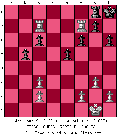 Last move : 1-0 2024 March 5 23:39:31 [Event "FICGS__CHESS__RAPID_D__000153"] [Site "FICGS"] [Date "2024.01.21"] [Round "1"] [White "Martinez,Silvio"] [Black "Leurette,Marc-Antoine"] [Result "1-0"] [WhiteElo "1291"] [BlackElo "1625"] 1.e4 e5 2.Nf3 Nc6 3.Nc3 Nf6 4.d4 exd4 5.Nxd4 Bb4 6.Bd2 Nxd4 7.e5 Qe7 8.Bf4 d6 9.Bc4 Ne4 10.Qxd4 Bxc3+ 11.bxc3 dxe5 12.Qxe4 f6 13.Bc1 c6 14.O-O Be6 15.Rd1 O-O 16.a4 Bxc4 17.Qxc4+ Kh8 18.Ba3 Qe8 19.Bxf8 Qxf8 20.Rd7 Rb8 21.Qf7 Qxf7 22.Rxf7 a6 23.Rd1 b5 24.axb5 axb5 25.g3 h6 26.R1d7 Rg8 27.Rc7 1-0 Follow this game move after move (download)Half the variations which are calculated in a tournament game turn out to be completely superfluous. Unfortunately, no one knows in advance which half. (Jan Tinman) Drei Punkte vor allen anderen ist wie einer, der im weißen Anzug posiert, während der Rest in Müllsäcke gekleidet dasteht. (Viktor Kortschnoi) Por tratar de evitar la pérdida de una pieza, muchas personas han perdido una partida de Ajedrez. (Savielly Tartakover) Pour moi, les échecs ne sont pas un jeu mais un art. (Alexandre Alekhine) The difference between perseverance and obstinacy is that one comes from a strong will, and the other from a strong won't. (Henry Ward Beecher)