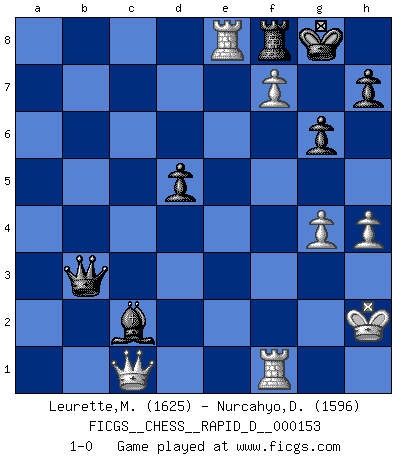 Last move : 1-0 2024 April 16 3:10:36 [Event "FICGS__CHESS__RAPID_D__000153"] [Site "FICGS"] [Date "2024.01.21"] [Round "1"] [White "Leurette,Marc-Antoine"] [Black "Nurcahyo,Dery"] [Result "1-0"] [WhiteElo "1625"] [BlackElo "1596"] 1.e4 f6 2.d4 d5 3.exd5 Qxd5 4.Nc3 Qf7 5.Bd3 Nc6 6.Nf3 Bg4 7.Be3 O-O-O 8.h3 Bd7 9.O-O e6 10.a3 Bd6 11.b4 a6 12.b5 axb5 13.Nxb5 Be8 14.a4 Bb4 15.c3 Ba5 16.Qc2 g6 17.Na3 Nge7 18.Nc4 Nd5 19.Nxa5 Nxa5 20.Bd2 b6 21.c4 Ne7 22.Bxa5 bxa5 23.c5 Nd5 24.Ba6+ Kd7 25.c6+ Ke7 26.Qc5+ Rd6 27.Ne5 Qg7 28.Nc4 f5 29.Rae1 Nb4 30.Nxd6 cxd6 31.Qxa5 Nxc6 32.Qc7+ Bd7 33.d5 Ne5 34.Bb5 Rc8 35.Qb7 Rd8 36.dxe6 Kxe6 37.Bc4+ Kf6 38.Qb6 Qe7 39.Bd5 f4 40.f3 Bxa4 41.Qb4 Qa7+ 42.Kh2 Bc2 43.Qxf4+ Kg7 44.Qg5 Rf8 45.f4 Rf5 46.Qh4 Nf7 47.Bxf7 Rxf7 48.Qf2 Qa4 49.g3 d5 50.h4 Be4 51.Qb2+ Kh6 52.g4 Bc2 53.Qc1 Qb3 54.f5 Kg7 55.f6+ Kg8 56.Re8+ Rf8 57.f7+ 1-0 Follow this game move after move (download)In Chess, at least, the brave inherit the earth. (Edmar Mednis) Schachspieler können ausgezeichnet Varianten am Schachbrett berechnen, aber nicht im realen Leben. Zu stark ist der Individualismus im Schach ausgeprägt, und für viele ist ein kleiner momentaner persönlicher Vorteil wichtiger als ein weit größerer Vorteil von morgen. (Anatoly Karpov) El Ajedrez era la lengua materna de Capablanca. (Reti) Ce qui caractérise les parties de combat, c'est que si le défenseur a constamment de difficiles problèmes à résoudre, l'attaquant doit chercher sans relâche de nouvelles possibilités d'attaque. (Koblentz) The project of the man are lower than those of the sky. (Chinese proverb)