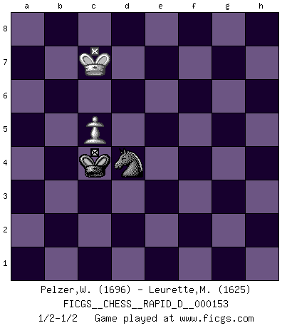 Last move : 1/2-1/2 2024 April 30 17:1:39 [Event "FICGS__CHESS__RAPID_D__000153"] [Site "FICGS"] [Date "2024.01.21"] [Round "1"] [White "Pelzer,Willi"] [Black "Leurette,Marc-Antoine"] [Result "1/2-1/2"] [WhiteElo "1696"] [BlackElo "1625"] 1.e4 e5 2.d4 exd4 3.c3 d5 4.Qxd4 Be6 5.f4 Nc6 6.Bb5 a6 7.Bxc6+ bxc6 8.Qa4 Bd7 9.Qd4 dxe4 10.Qxe4+ Qe7 11.Nd2 Nf6 12.Qxe7+ Bxe7 13.Ngf3 O-O 14.Ne5 Rfe8 15.O-O Bd6 16.Nxd7 Nxd7 17.Nb3 a5 18.Kf2 a4 19.Nd4 c5 20.Nb5 Rab8 21.Nxd6 cxd6 22.Rd1 Rb6 23.b3 axb3 24.axb3 Rxb3 25.Rxd6 Nf6 26.Rd3 c4 27.Rf3 Ng4+ 28.Kg3 f5 29.h3 Nh6 30.Ba3 Ra8 31.Bb2 Rxa1 32.Bxa1 Rb1 33.Re3 Rxa1 34.Re8+ Kf7 35.Rc8 Ra3 36.Rxc4 Ng8 37.Kh4 g6 38.g4 Ne7 39.Rc5 fxg4 40.hxg4 Ke6 41.Kg5 Ng8 42.Rc8 Kf7 43.c4 h6+ 44.Kh4 Ne7 45.Rh8 Ng8 46.Rh7+ Kf6 47.Rb7 Rf3 48.g5+ hxg5+ 49.fxg5+ Kf5 50.Rf7+ Ke4 51.Rg7 Rf8 52.Rxg6 Ne7 53.Re6+ Kf4 54.Rf6+ Nf5+ 55.Kh3 Rh8+ 56.Kg2 Kxg5 57.Rc6 Kf4 58.Rf6 Ke5 59.Rc6 Kd4 60.Kf3 Kd3 61.Kf4 Rf8 62.Ke5 Ne3 63.c5 Kc4 64.Ke6 Nf5 65.Kd7 Nd4 66.Rc7 Rf7+ 67.Kc8 Rxc7+ 68.Kxc7 1/2-1/2 Follow this game move after move (download)As one by one I mowed them down, my superiority soon became apparent. (Jose Capablanca) Bis jetzt ist Weiß einer wohlbekannten Analyse gefolgt. Aber jetzt begeht er einen schrecklichen Fehler: Er beginnt seinen eigenen Kopf zu benutzen. (Siegbert Tarrasch) El Ajedrez es un regaderazo frío para la mente. (Sir John Simon) On n'a jamais que l'âge auquel on a commence à jouer aux échecs car après on cesse de vieillir. (Capablanca) Are you threatening me, Master Jedi ? (Chancellor Palpatine in Star Wars ep.3)