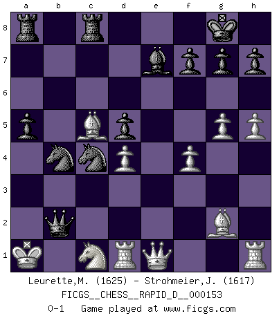 Last move : 0-1 2024 April 1 23:14:7 [Event "FICGS__CHESS__RAPID_D__000153"] [Site "FICGS"] [Date "2024.01.21"] [Round "1"] [White "Leurette,Marc-Antoine"] [Black "Strohmeier,Josef"] [Result "0-1"] [WhiteElo "1625"] [BlackElo "1617"] 1.e4 c5 2.Nc3 Nc6 3.g3 e6 4.Bg2 a6 5.d3 d6 6.Be3 Be7 7.Nge2 Qc7 8.Qd2 Nf6 9.O-O-O O-O 10.f3 b5 11.a3 b4 12.Nb1 a5 13.h4 Bd7 14.g4 bxa3 15.Nxa3 Nb4 16.g5 Ne8 17.Kb1 d5 18.exd5 exd5 19.c3 Nc6 20.Nb5 Qb6 21.c4 Nb4 22.h5 Bxb5 23.cxb5 Qxb5 24.f4 Qa4 25.Nc1 Nd6 26.Bxc5 Rfc8 27.d4 Nc4 28.Qe1 Qc2+ 29.Ka1 Qxb2+ 0-1 Follow this game move after move (download)It's always better to sacrifice your opponent's men. (Savielly Tartakover) Der Vorposten provoziert a) eine Basis für neue Angriffe und b) eine Schwächung der gegnerischen Widerstandskraft in der fraglichen Linie. (Aaron Nimzowitsch) El jugador táctico debe saber que hacer cuando algo se debe de hacer. El estratégico debe saber que hacer cuando nada se debe de hacer. (Savielly Tartakover) Il (Jacob Murray) ne joue pas pour le bon coup, mais pour le meilleur. (Eloi Relange) Control your own destiny or someone else will. (Jack Welch)