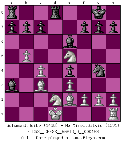 Last move : 0-1 2024 March 21 16:44:33 [Event "FICGS__CHESS__RAPID_D__000153"] [Site "FICGS"] [Date "2024.01.21"] [Round "1"] [White "Goldmund,Heike"] [Black "Martinez,Silvio"] [Result "0-1"] [WhiteElo "1498"] [BlackElo "1291"] 1.b4 Nf6 2.Bb2 d5 3.e3 e5 4.a3 Nc6 5.b5 Na5 6.d3 Bc5 7.Nf3 e4 8.Ne5 O-O 9.dxe4 dxe4 10.c4 Qxd1+ 11.Kxd1 Rd8+ 12.Nd2 Be6 13.Be2 Nb3 14.Bc3 Nxa1 15.Bxa1 Bxa3 16.Bc3 Ng4 0-1 This chess game has been lost on time (started : 2024.01.21 0:35:5) Follow this game move after move (download)Becoming successful at Chess allows you to discover your own personality. That's what I want for the kids I teach. (Saudin Robovic) Die unerbitterlichsten Regeln im Schach sind die Ausnahmen. (Savielly Grigorievitsch Tartakower) Una victoria por una combinación errónea, aunque sea espectacular, me llena de horror artístico. (Wilhelm Steinitz) Un millionnaire : 'Monsieur Steinitz ! Vous ne participez aux tournois que pour l'argent, alors que moi je n'y viens que pour l'honneur.' Steinitz : 'Chacun joue pour ce qu'il n'a pas'... It is a good thing for an uneducated man to read books of quotations. (Winston Churchill)