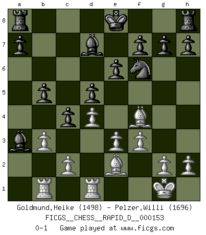Last move : 0-1 2024 April 8 19:30:28 [Event "FICGS__CHESS__RAPID_D__000153"] [Site "FICGS"] [Date "2024.01.21"] [Round "1"] [White "Goldmund,Heike"] [Black "Pelzer,Willi"] [Result "0-1"] [WhiteElo "1498"] [BlackElo "1696"] 1.d4 d5 2.Nf3 Nd7 3.Bf4 Ngf6 4.e3 e6 5.Bd3 c5 6.Nbd2 c4 7.Be2 Qb6 8.Rb1 Qa5 9.a3 Ne4 10.O-O b5 11.Ne5 Qxd2 12.f3 Qxd1 13.Rfxd1 Nef6 14.Nxd7 Bxd7 15.b3 Bxa3 0-1 This chess game has been lost on time (started : 2024.01.21 0:35:5) Follow this game move after move (download)Chess is the art which expresses the science of logic. (Mikhail Botvinnik) Korrekt heißt in Deutschland die Haltung eines Mannes, dessen Benehmen nach dem Urteile seiner Nachbarn seiner Stellung angemessen ist. Um korrekt zu sein, muß man sich der Meinung der anderen anpassen... (Emanuel Lasker) Fischer deseaba darle a los Rusos una sopa de su propia medicina. (Larry Evans) A chaque perte on perd un peu de soi. (Joël Lautier) Man is still the most extraordinary computer of all. (John F. Kennedy)