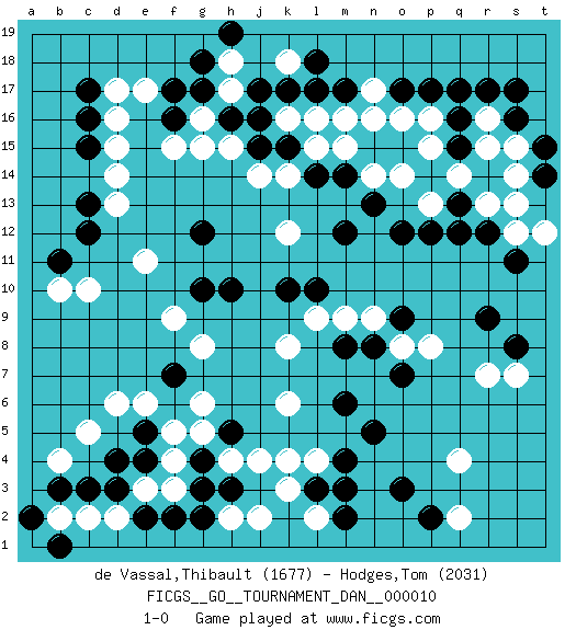 Last move : 1-0 2008 January 15 15:37:50 [Event "FICGS__GO__TOURNAMENT_DAN__000010 "] [Site "FICGS"] [Date "2007.09.12"] [Round "1"] [Black "de Vassal,Thibault "] [White "Hodges,Tom "] [Result "1-0"] [Rating 1 "1677"] [Rating 2 "2031"] 1.q17 q4 2.c16 r15 3.d3 p16 4.p17 o16 5.o17 n16 6.s16 n17 7.r12 e17 8.j16 d15 9.c15 d14 10.c13 d13 11.c12 j14 12.f16 d16 13.f17 g15 14.l17 h17 15.h16 g16 16.g17 h18 17.g18 k18 18.l18 f15 19.h19 e11 20.r9 c5 21.g3 c10 22.c17 d17 23.e5 d6 24.o3 r7 25.m4 q2 26.o12 k16 27.k17 l16 28.m12 k12 29.f7 k3 30.l3 k4 31.m6 k6 32.m8 k8 33.l10 l9 34.k10 g5 35.m14 m15 36.k15 l15 37.l14 n14 38.n13 o14 39.m17 m16 40.q13 q14 41.q16 p13 42.p12 r13 43.q12 r16 44.r17 s15 45.s17 s13 46.q15 s12 47.s11 p15 48.r14 k14 49.j15 t12 50.t15 s14 51.t14 m9 52.o9 n9 53.n8 o8 54.o7 p8 55.n5 c2 56.c3 b2 57.b3 d2 58.e2 e3 59.e4 f3 60.f2 f4 61.g4 f5 62.h5 g6 63.d4 e6 64.a2 b4 65.b1 h4 66.h3 j4 67.h10 h2 68.g2 g8 69.g10 f9 70.b11 b10 71.s8 s7 72.g12 h15 73.j17 l2 74.m2 l4 75.m3 j2 76.p2 1-0 Here are the names of the openings (joseki) played in the four corners : Corner q16 : q17 r15Komoku (Somok, Xiao~mu`) 3-4 Point. The komoku (3-4) point is the traditional corner enclosure move..Ikken Kakari (Hankan Keolch'im, Yi Gua`jiao~, 1-Space Low Pincer). The small knight move is the basic approach move to the 3-4 point stone. It has been continually used for over four centuries. There are limitless variations, with new moves constantly being discovered. White 2 opens the door to a treaure store of joseki. Corner d16 : c16 e17Komoku (Somok, Xiao~mu`) 3-4 Point. The komoku (3-4) point is the traditional corner enclosure move..Ikken Kakari (Hankan Keolch'im, Yi Gua`jiao~, 1-Space Low Pincer). The small knight move is the basic approach move to the 3-4 point stone. It has been continually used for over four centuries. There are limitless variations, with new moves constantly being discovered. White 2 opens the door to a treaure store of joseki. Corner q4 : q4 r9Hoshi (Hwajeom, Seongjeom, Xingwei`) 4-4 Point. The star or hoshi (4-4) point, emphasizing influence at the potential expense of territory. Corner d4 : d3 c5Komoku (Somok, Xiao~mu`) 3-4 Point. The komoku (3-4) point is the traditional corner enclosure move..Ikken Kakari (Hankan Keolch'im, Yi Gua`jiao~, 1-Space Low Pincer). The small knight move is the basic approach move to the 3-4 point stone. It has been continually used for over four centuries. There are limitless variations, with new moves constantly being discovered. White 2 opens the door to a treaure store of joseki. Player Black won this Go (weiqi, baduk) game.Follow this game move after move (download ) Answer the keima with a kosumi. (Anonymous) Wikichess, chess moves explained by 'experimented' players. (Thibault de Vassal)