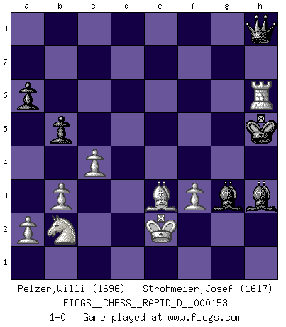 Last move : 1-0 2024 May 14 21:39:6 [Event "FICGS__CHESS__RAPID_D__000153"] [Site "FICGS"] [Date "2024.01.21"] [Round "1"] [White "Pelzer,Willi"] [Black "Strohmeier,Josef"] [Result "1-0"] [WhiteElo "1696"] [BlackElo "1617"] 1.c4 e5 2.Nc3 Nf6 3.g3 c6 4.Bg2 d6 5.e3 Qc7 6.Nge2 Be7 7.O-O O-O 8.d4 Nbd7 9.Bd2 a6 10.Rc1 Nb6 11.b3 Bg4 12.Qe1 h6 13.dxe5 dxe5 14.Ne4 Nxe4 15.Bxe4 f5 16.Bg2 Rad8 17.Ba5 c5 18.Nc3 Rd6 19.Bd5+ Kh8 20.Na4 Bd8 21.Bxb6 Qb8 22.Bxc5 f4 23.exf4 exf4 24.f3 Bh3 25.Qe5 Bc7 26.Rfe1 fxg3 27.hxg3 Rg6 28.Qh5 Rxg3+ 29.Kf2 Bg4 30.Qxh6+ gxh6 31.Bd4+ Kh7 32.Re7+ Kg6 33.Rg7+ Kh5 34.Bf7+ Rxf7 35.Rxf7 Be6 36.Rh1+ Rh3 37.Rxh3+ Bxh3 38.Be3 Bg3+ 39.Ke2 b5 40.Nb2 Qe8 41.Rf6 Qh8 42.Rxh6+ 1-0 Follow this game move after move (download)If cunning alone were needed to excel, women would be the best Chess players. (Albin) Am wohlsten fühle ich mich, wenn ich sehe, wie sich mein Gegner im Todeskampf windet. (Robert James Fischer) Personalmente, yo prefiero mirar hacia el futuro en donde un programa de computadora gane el título mundial de Ajedrez. La humanidad necesita una lección de humildad. (Richard Dawkings) Avant la finale, les dieux ont créé le milieu de partie. (Tarrasch) Go and wake up your luck. (Persian saying)